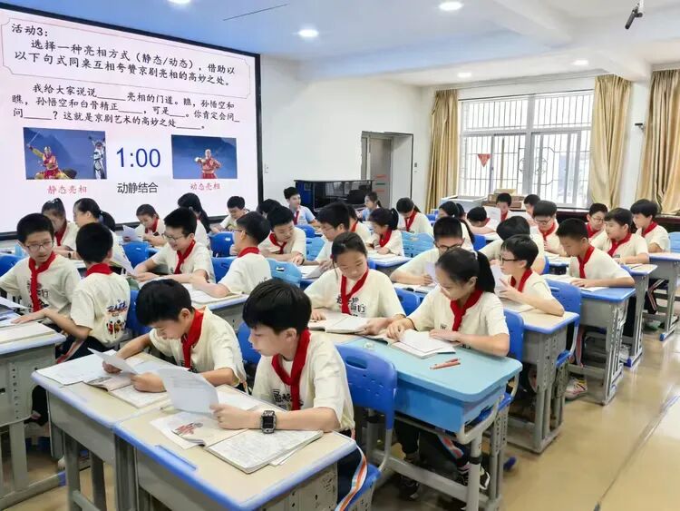 教学过程中,黄老师引导精准灵动,从文本自主梳理到直观辅助赏析,从独立探究到合作交流,层层推进落实略读课学习要求。学生们或凝神研读文本,或踊跃分享阅读发现,或同桌探讨感悟,在沉浸式文本学习中既提升了略读能力,又触摸到京剧文化的趣味与魅力。课堂氛围鲜活热烈,不时响起清脆的应答与热烈的讨论声。