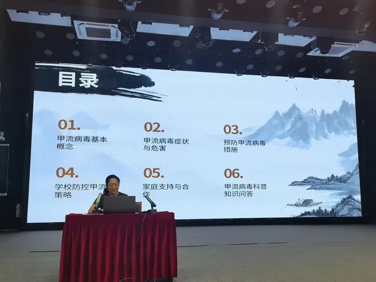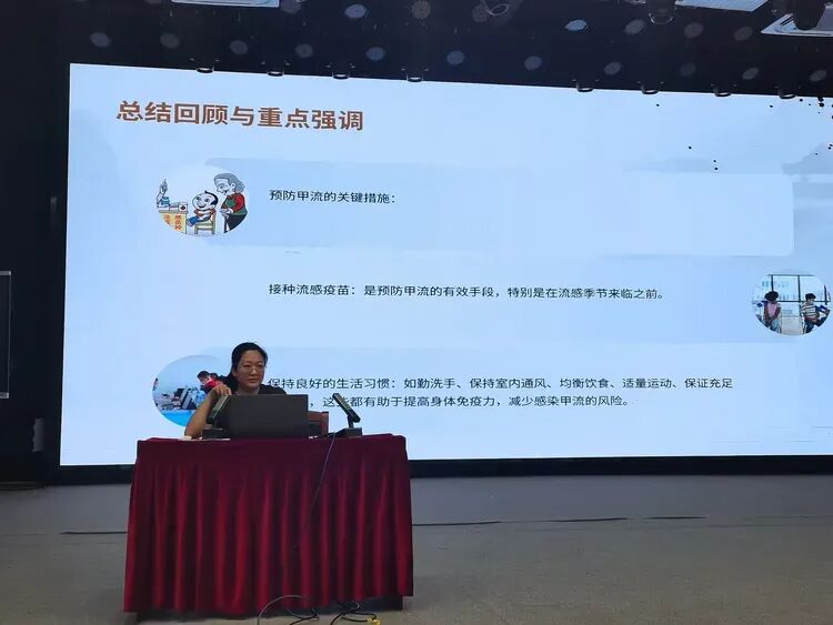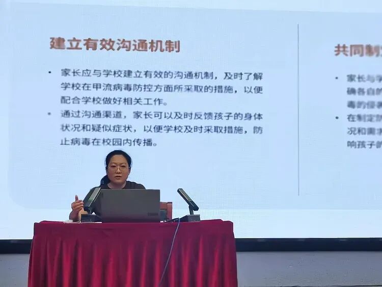 甲流传染性强、危害较大,但只要做好科学防控,就能有效降低感染风险。此次讲座中,符晓萍健康副校长重点强调,防控甲流要以预防为先,优先接种甲流疫苗,筑牢免疫基础;坚持良好的个人卫生习惯和防护措施,阻断病毒传播途径;学校精准落实防控举措,守护校园环境安全;家长积极配合学校,做好家庭防护和孩子健康监测,家校协同发力,共同抵御甲流病毒侵袭。