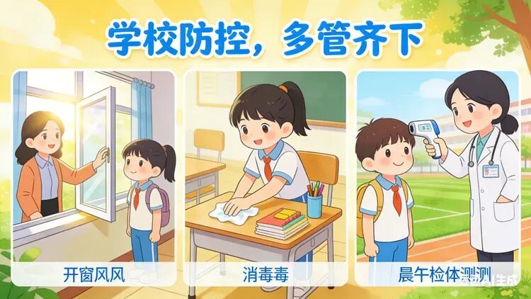 学校作为人员密集场所,多措并举做好甲流防控工作。一方面加强校园环境卫生管理,每日早、中、晚三次开窗通风,每次通风时间不少于30分钟,保持室内空气流通;定期对教室等公共场所及门把手、桌椅、楼梯扶手等高频接触表面进行清洁消毒,及时处理校园垃圾,减少病毒滋生。另一方面完善学生健康监测机制,严格落实晨午检和因病缺课登记追踪制度,全员覆盖无遗漏,查明缺课病因,发现传染病病例按规定及时处理。