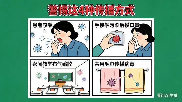 甲流病毒的传播方式隐蔽且多样,日常需重点防范:一是呼吸道飞沫传播,患者咳嗽、打喷嚏时产生的飞沫是主要传播载体;二是黏膜直接接触传播,与患者接触后触摸口鼻、眼睛等部位易被感染;三是气溶胶传播,密闭空间如教室、办公室内,病毒可通过空气悬浮传播;四是间接接触传播,共用被病毒污染的碗筷、毛巾等生活用品也可能中招。