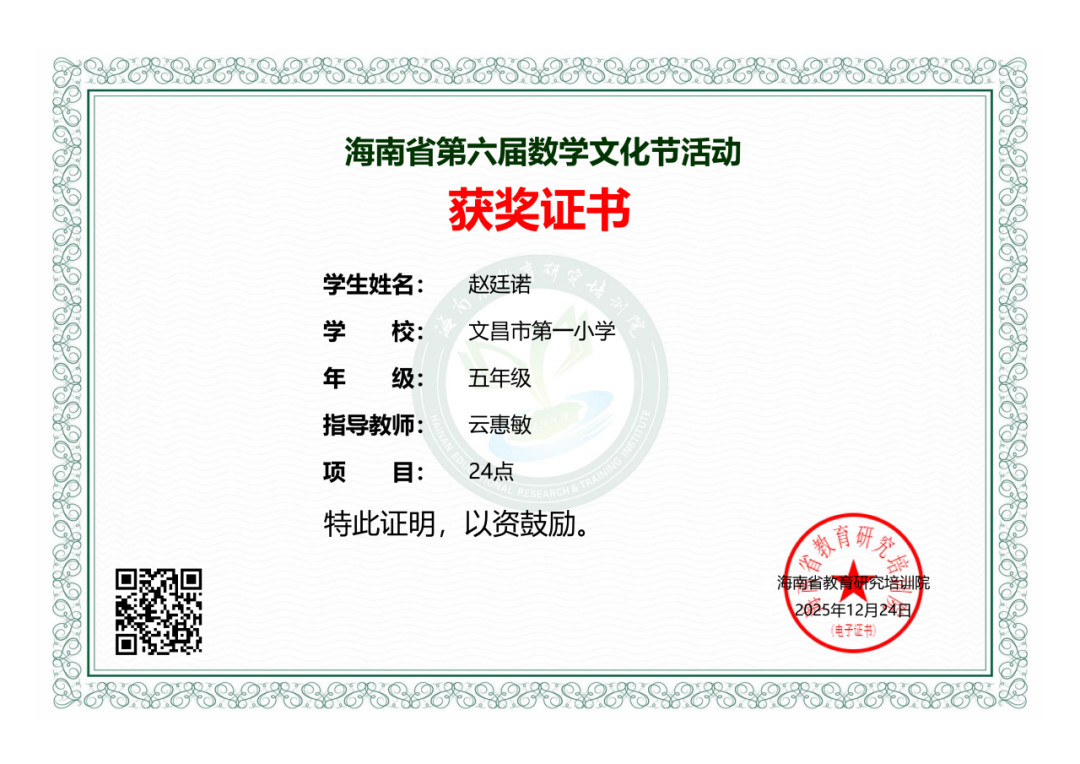 热烈祝贺在海南省教育研究培训院组织的第六届数学文化节活动中,我校学子积极参赛,展现风采,共有3位同学在本次省级评选中脱颖而出,荣获优胜奖(项目前十二名)。