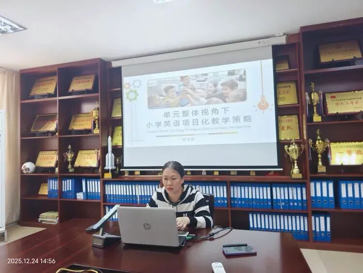 2025年12月24日,徐敏校长和韩东升副校长携全体英语教师齐聚于此,共同聆听了何玉珍老师带来的英语专题微讲座《单元整体视角下小学英语项目化教学策略》,共同开启一场关于项目化教学的深度探索之旅,一同揭开它神秘而迷人的面纱。