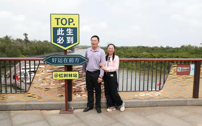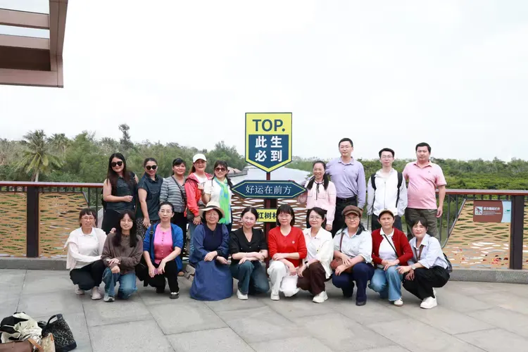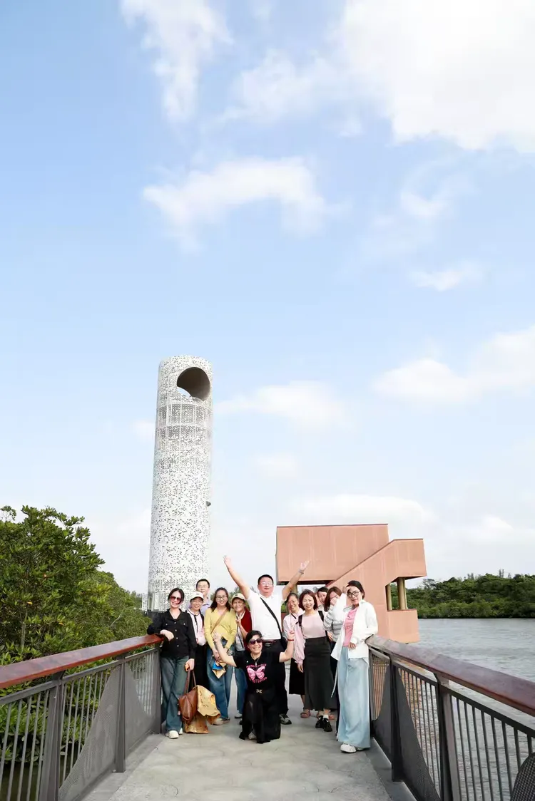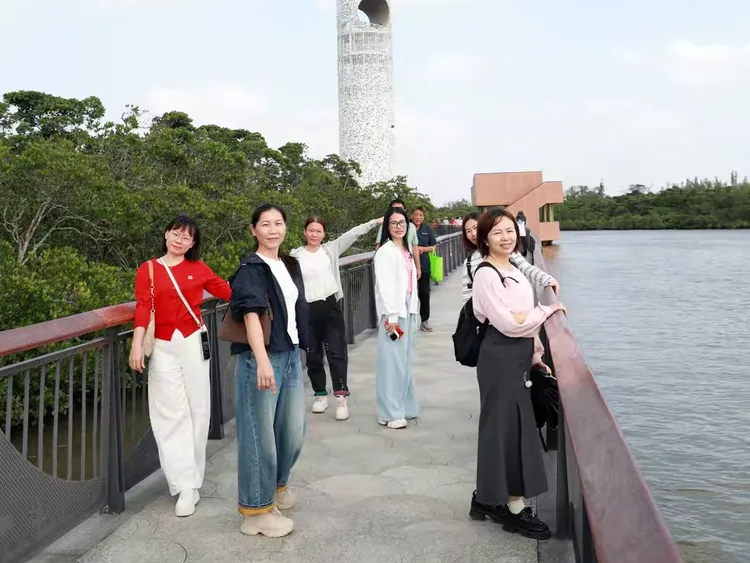 登顶海镜·月之塔,360度俯瞰东寨港红树林全景,海上森林的壮阔画卷在眼前徐徐展开。葱茏红树连成片,碧波粼粼映天光,老师们凭栏远眺,将这份春日独有的自然盛景尽收眼底,尽享此刻的悠然与惬意。