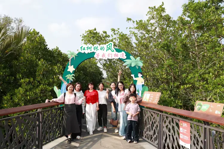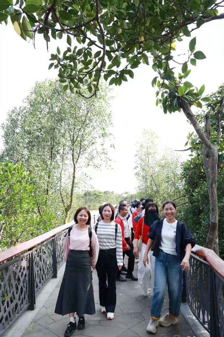 告别红树林博物馆,老师们踏上1700米科普栈道,漫步海上森林间。脚下是碧波漾漾,身旁是红树葱茏,目之所及皆是湿地自然之美,步履间尽赏春日生机,沉浸式感受这片海上绿洲的清新与灵动。