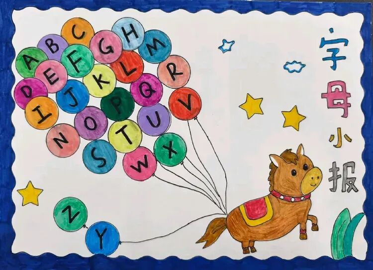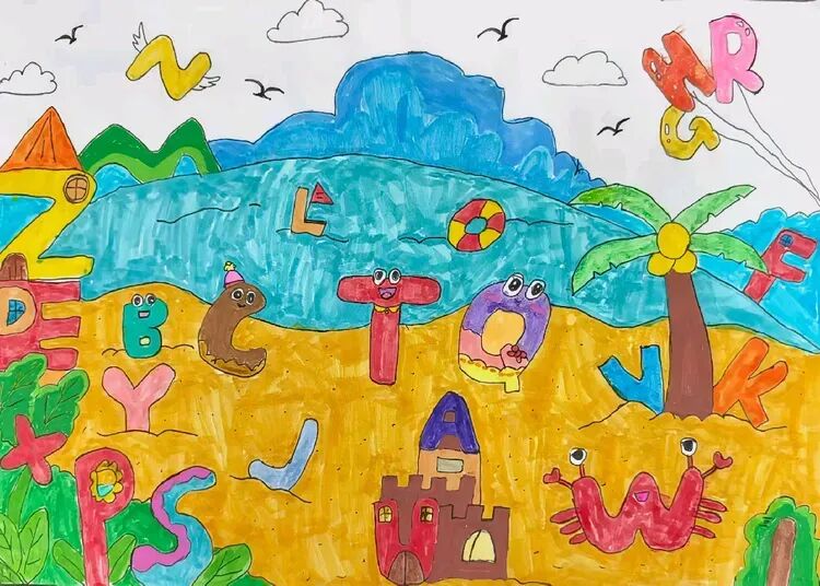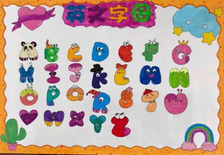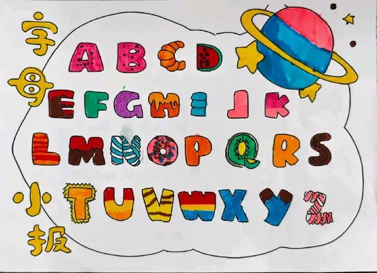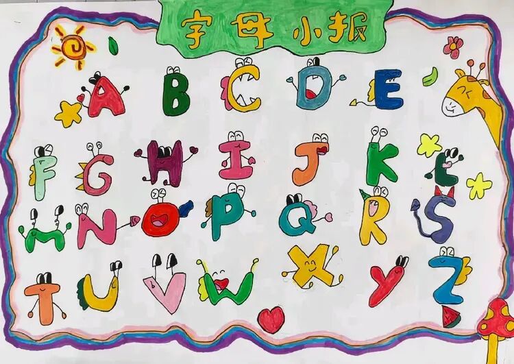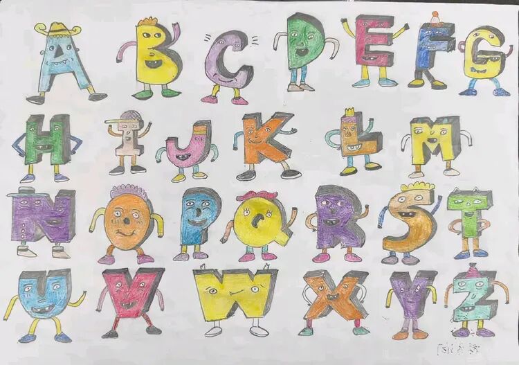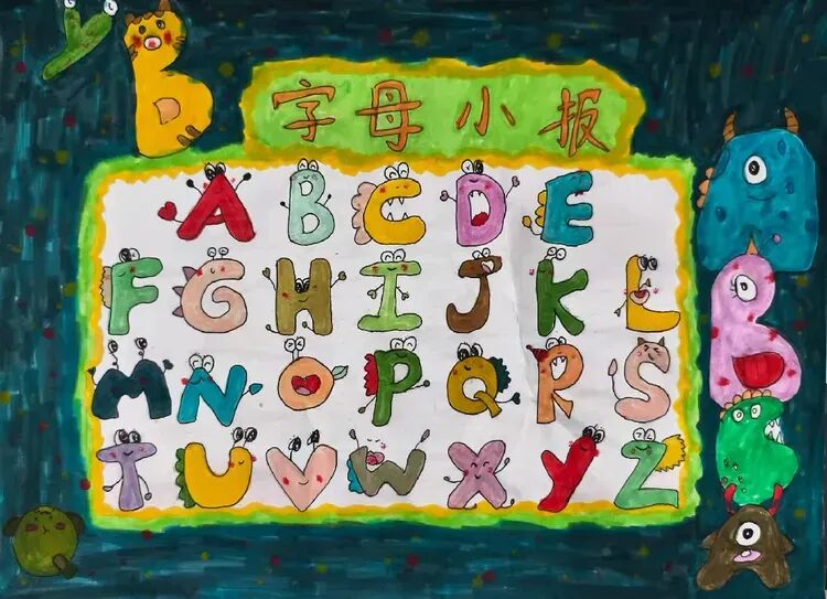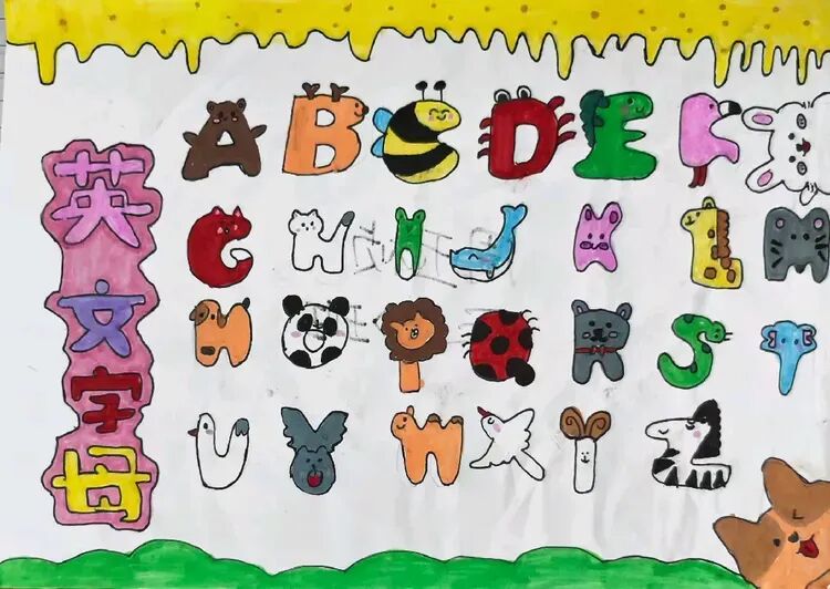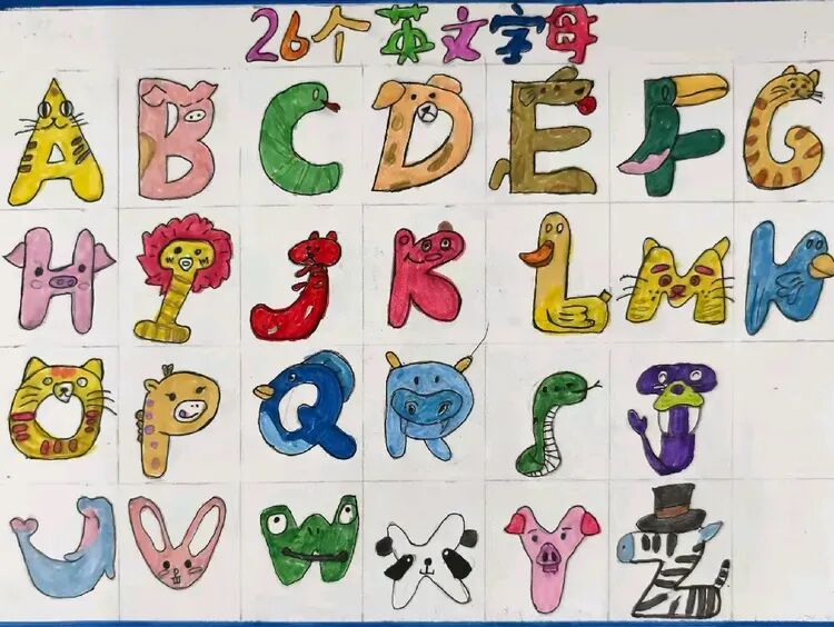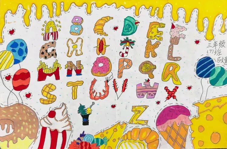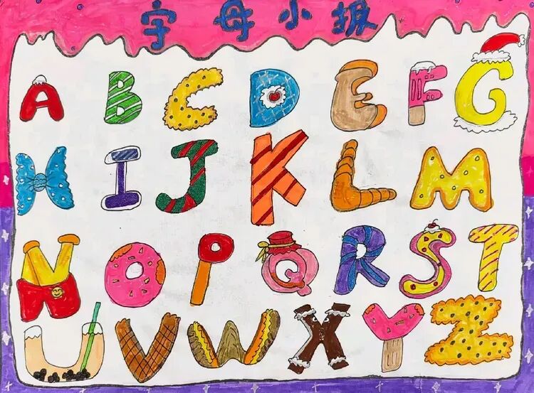 三年级的小设计师们化身“字母魔法师”,为26个英文字母注入了灵动生命力。他们打破常规,将字母与可爱动物、卡通形象巧妙融合,让冰冷的字母变成了会“说话”的小插画。