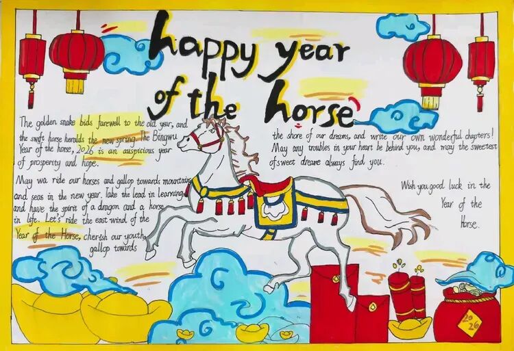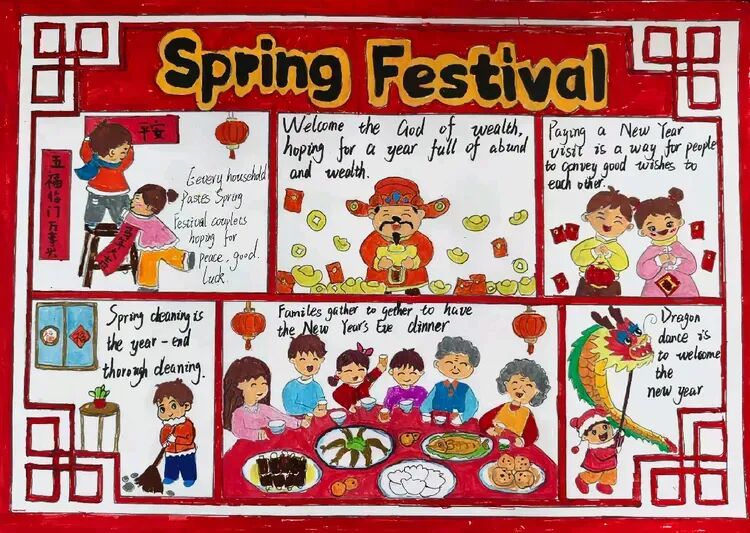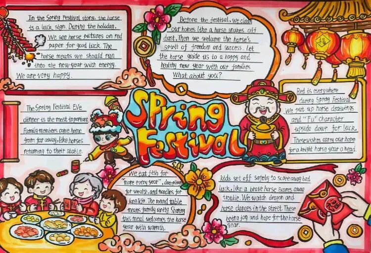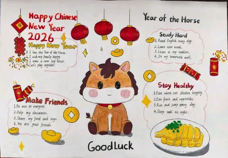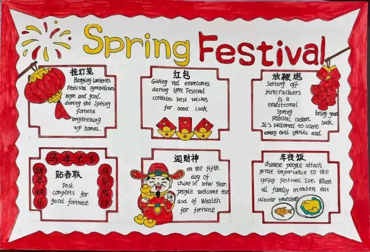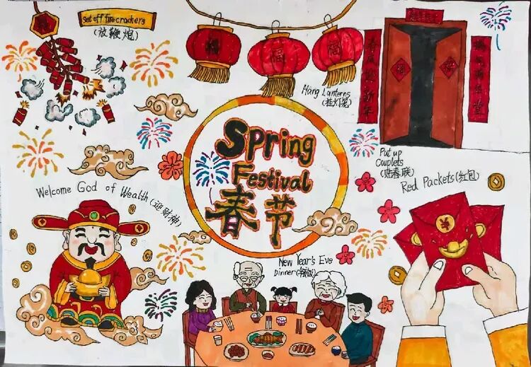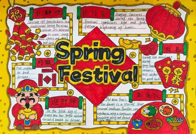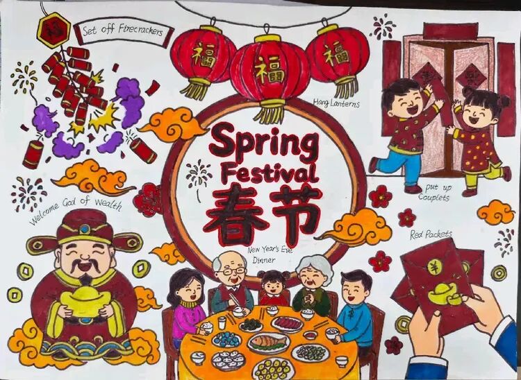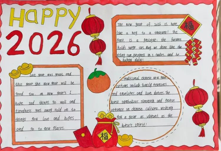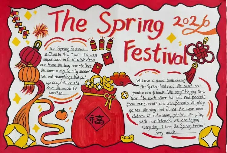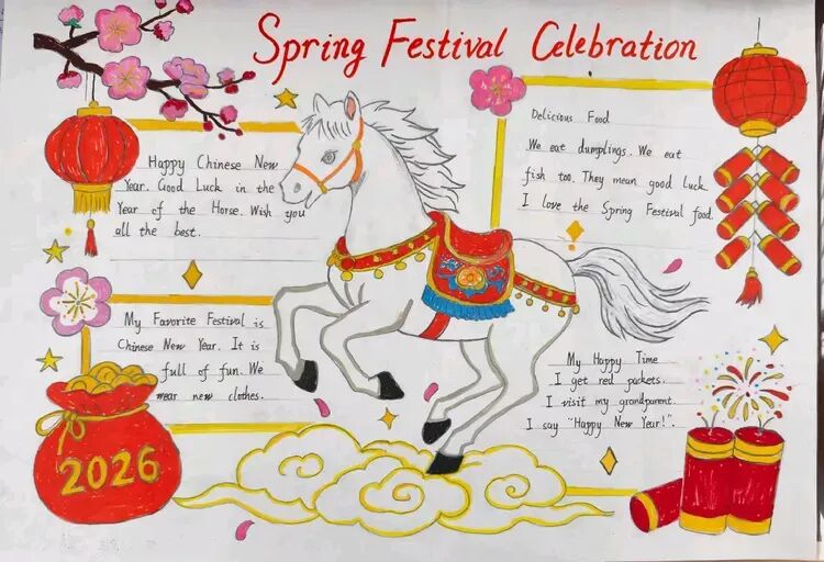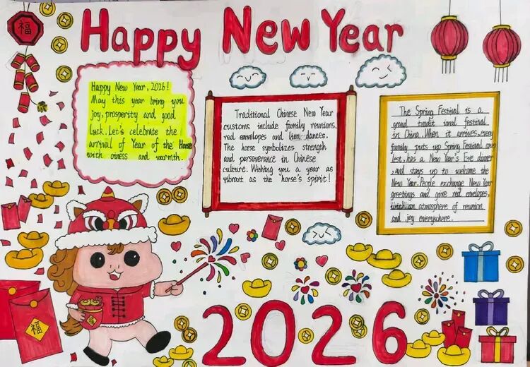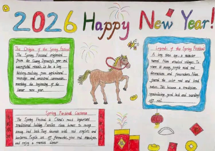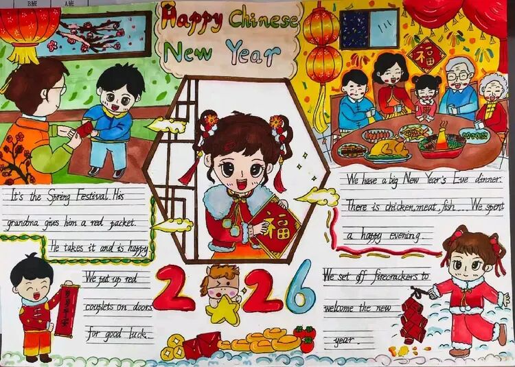 六年级的同学们围绕春节主题,创作了丰富多彩的英语手抄报,将新年计划、春节介绍、新年祝福等内容融入其中,让年味与英语学习深度融合。