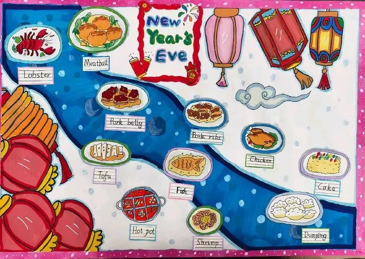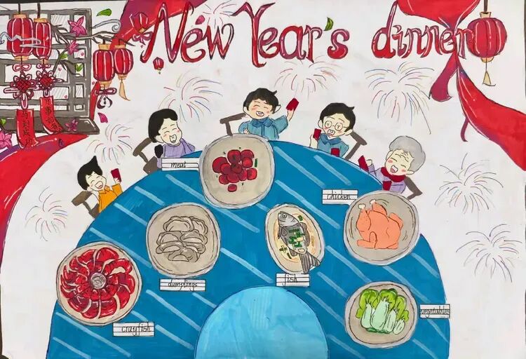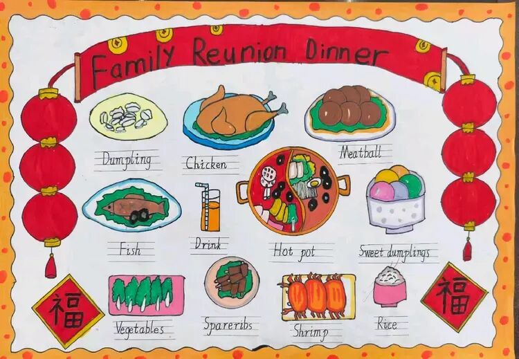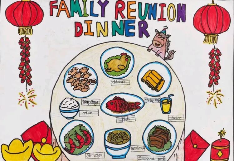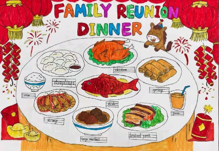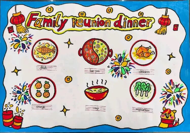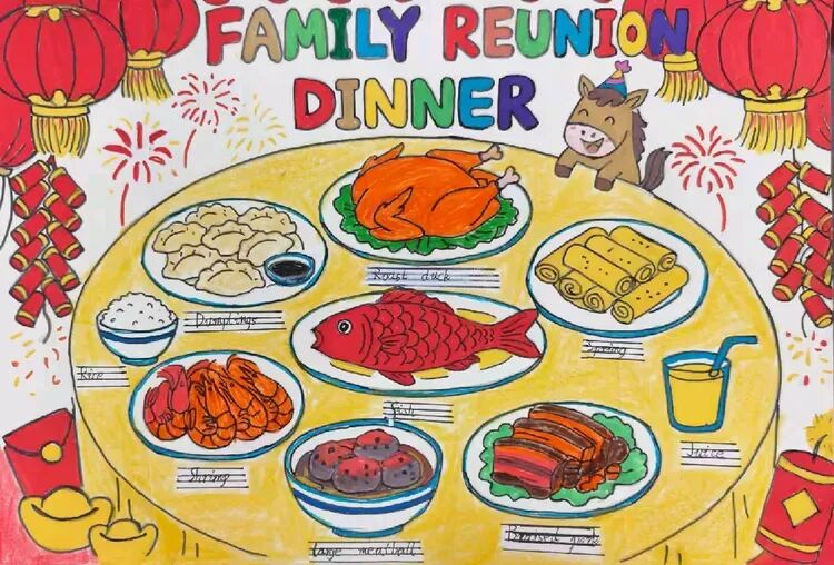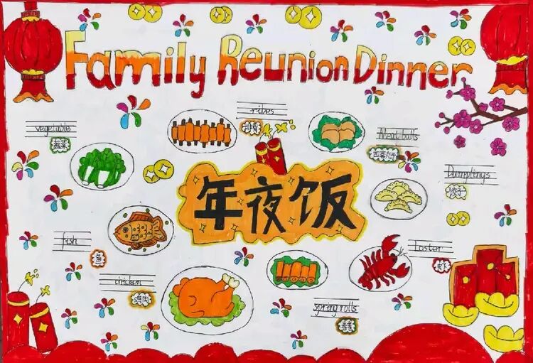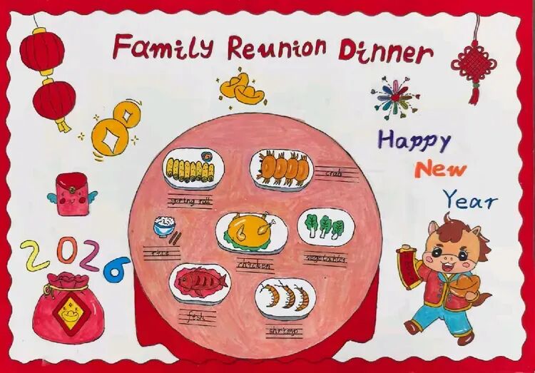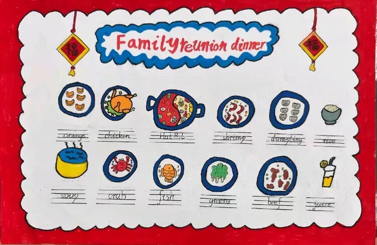 年夜饭是春节最温暖的仪式,四年级的同学们以“年夜饭菜单”为主题,用画笔与英文,精心勾勒出一桌桌充满寓意的团圆盛宴。孩子们选取鱼(Fish,象征年年有余)、饺子(Dumplings,象征招财进宝)、鸡(Chicken,象征大吉大利)等传统佳肴,并用四线三格工整书写英文菜名,让传统年味与英语表达相得益彰。