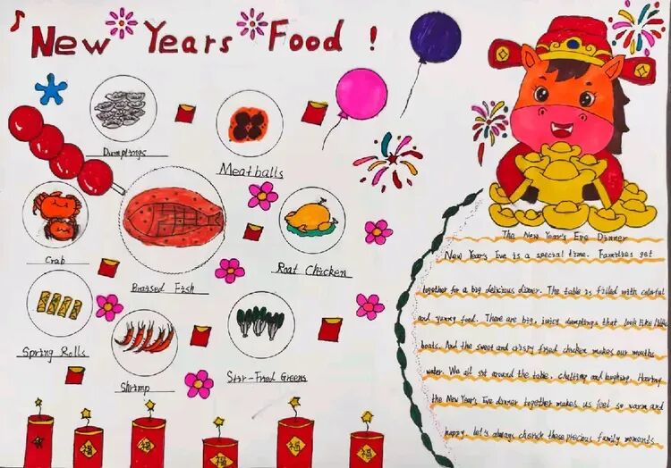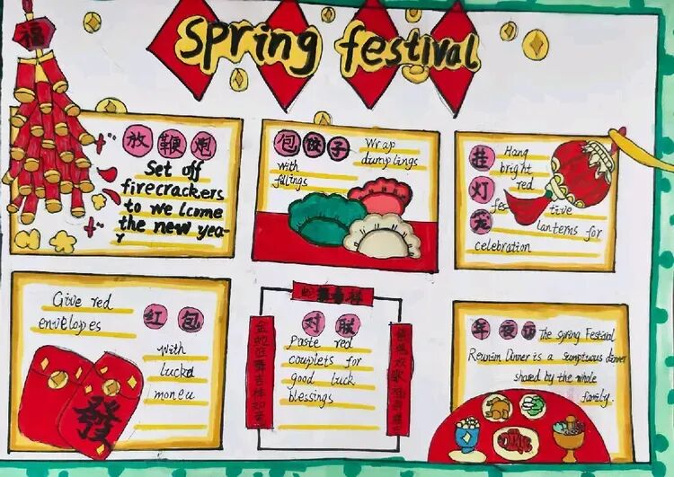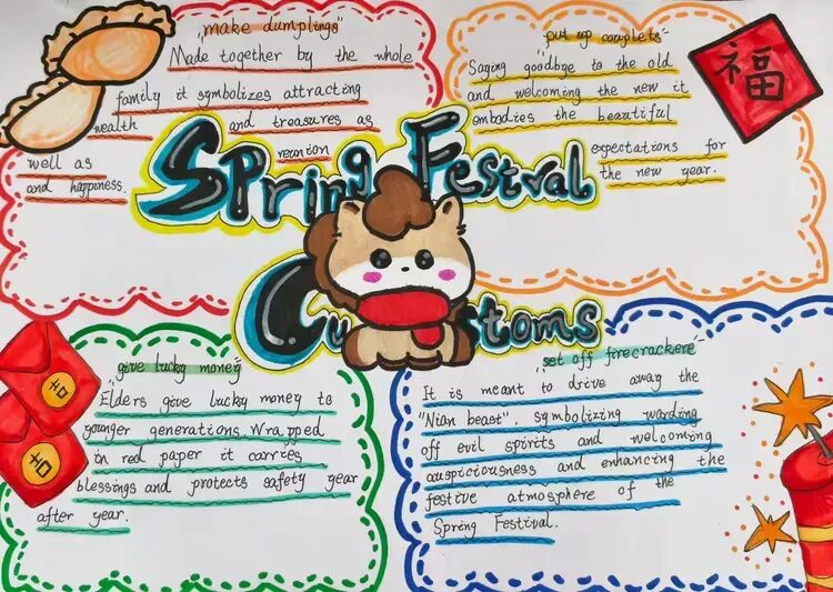 五年级的同学们聚焦春节传统习俗,用图文并茂的英文手抄报,将贴福字(Paste the character "Fu")、包饺子(Make dumplings)、拜年(Pay New Year's call)、放鞭炮(Set off firecrackers)等民俗故事娓娓道来。