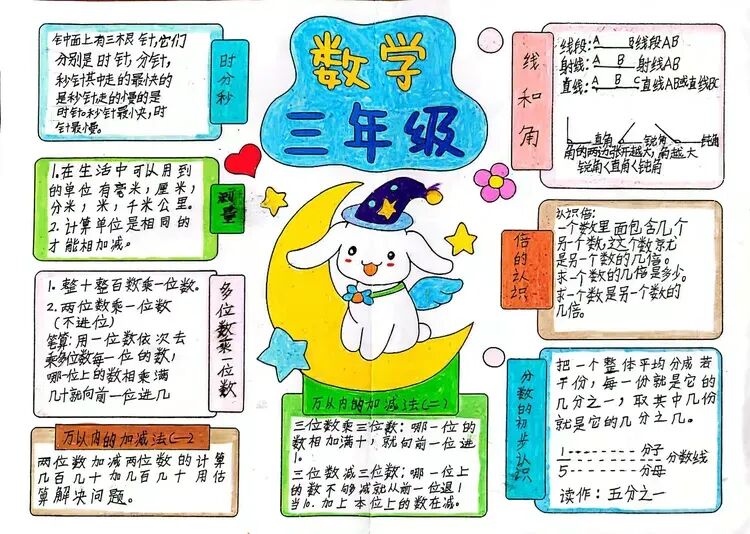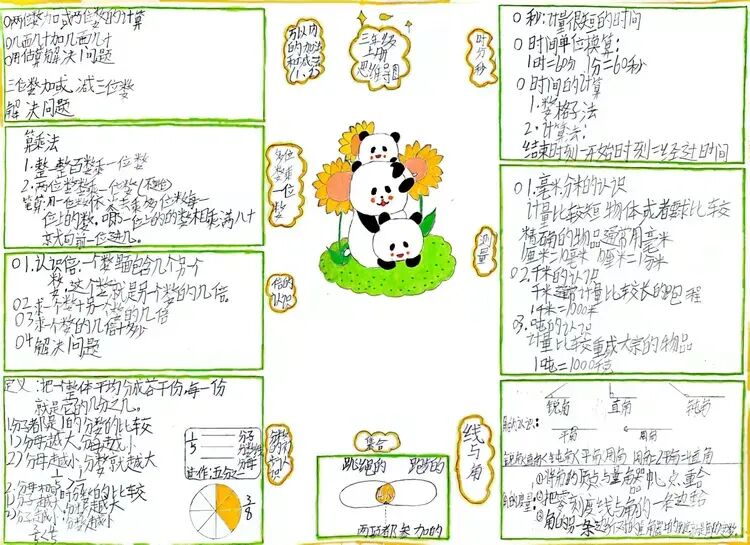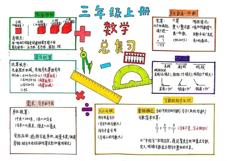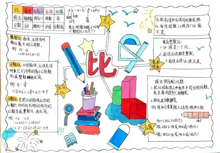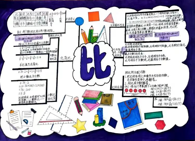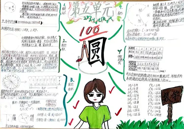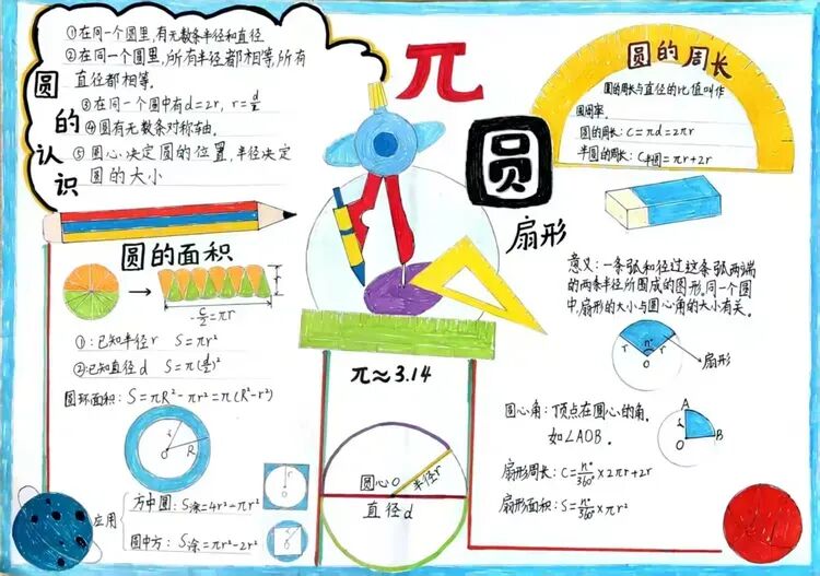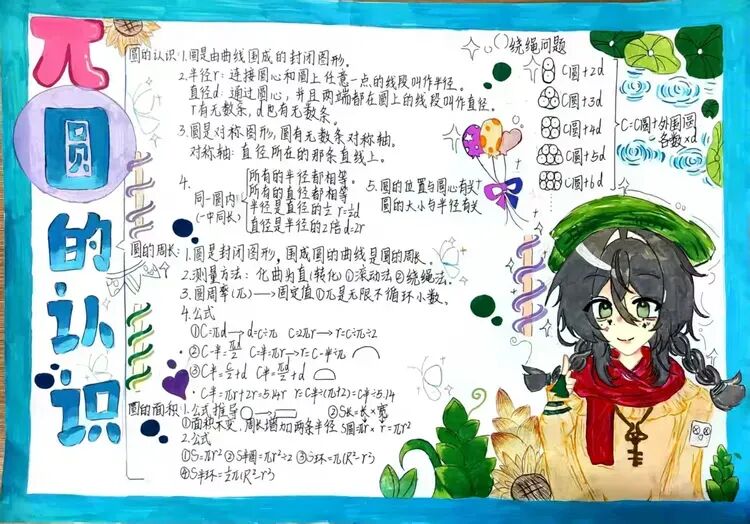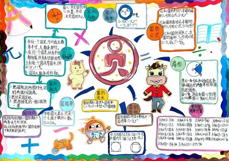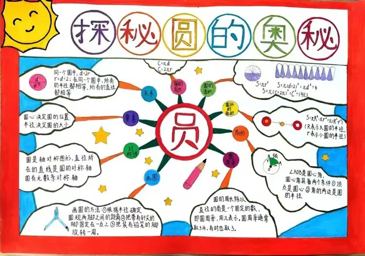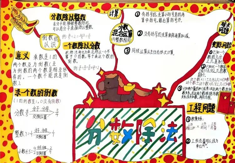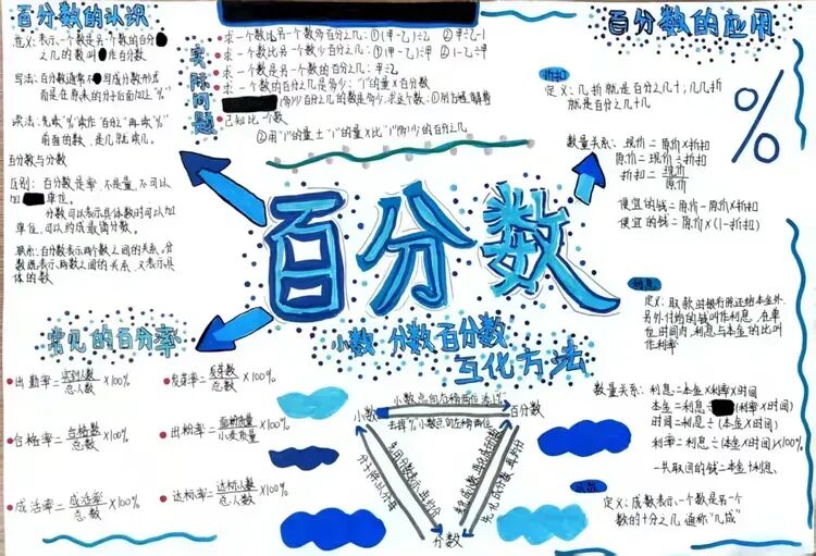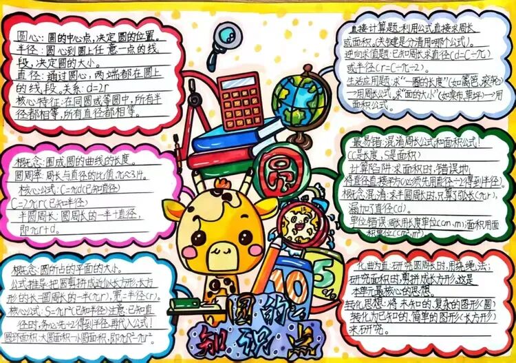 六年级的作品每张都充满创意,用太阳、卡通马这些元素把圆、分数、百分数这些知识点变得生动有趣。内容编排也很专业,从基础定义到复杂公式,还有生活案例和解题示范,把数学知识点变成了充满创意的视觉盛宴,既好看又好用!