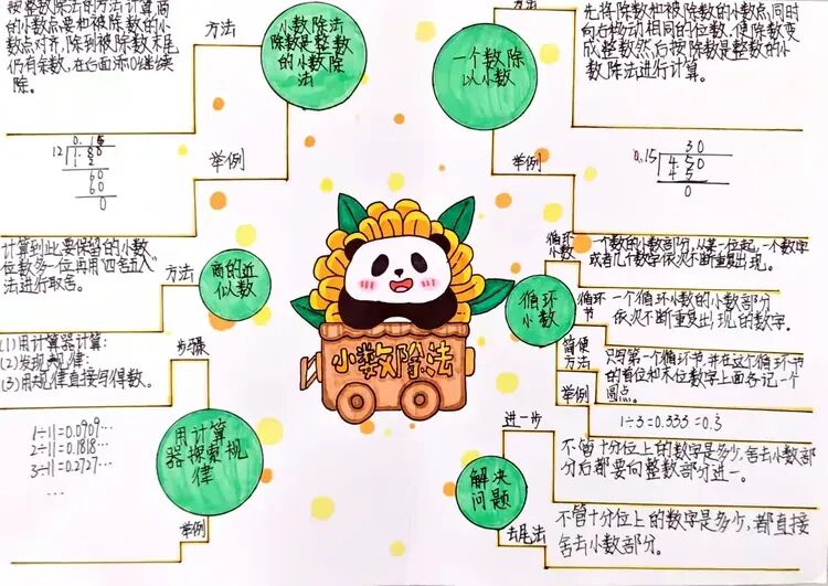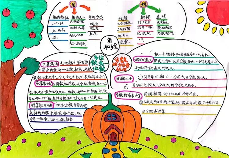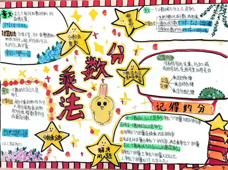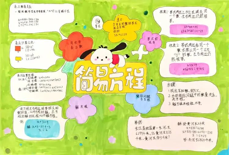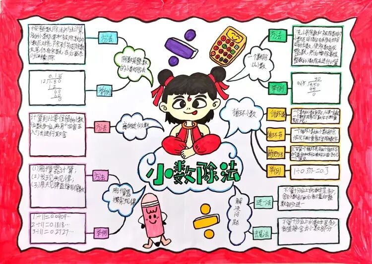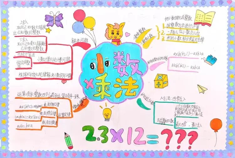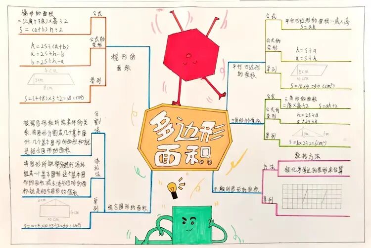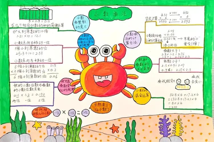 五年级的同学们提交的作品亮点纷呈,知识完整、层次清晰且设计精巧,充分发挥了思维导图的工具价值。其中,“简易方程”小报图文并茂结合实例,融合抽象原理与现实情境;“小数乘除法”小报梳理出多个知识模块,明确核心要点并拓展应用,凸显知识的系统性;“多边形面积”作品则将实操体验转化为理性认知,强化了空间观念。