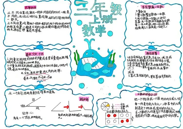 三年级复习主题设计太有想象力了,锁形、鲸鱼、南瓜屋,把数学变得生动有趣。知识点梳理得特别清晰,多位数乘法、分数、几何,重点一目了然。互动性超强,填空转盘、生活化案例,让学习不再枯燥。孩子们真是把数学玩出了新高度,为他们点赞!