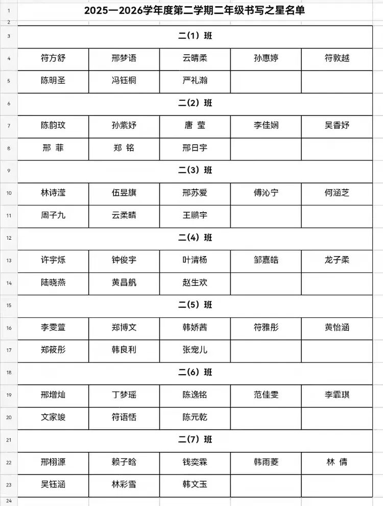 二年级书写之星