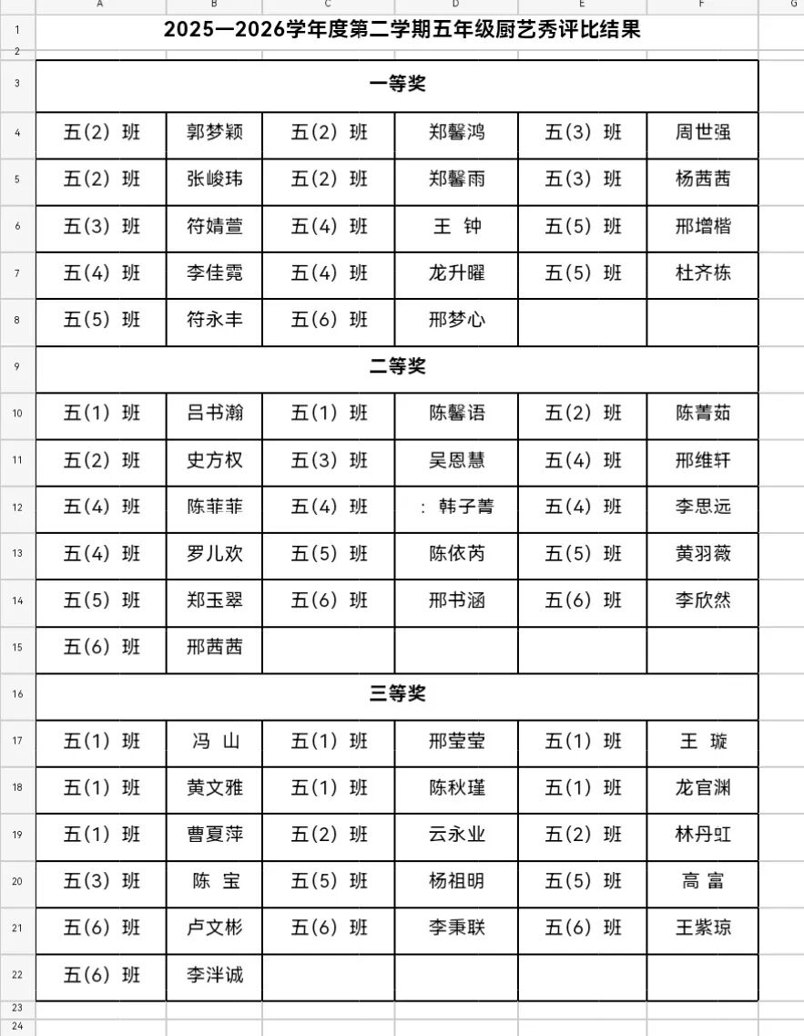 五年级厨艺秀获奖名单