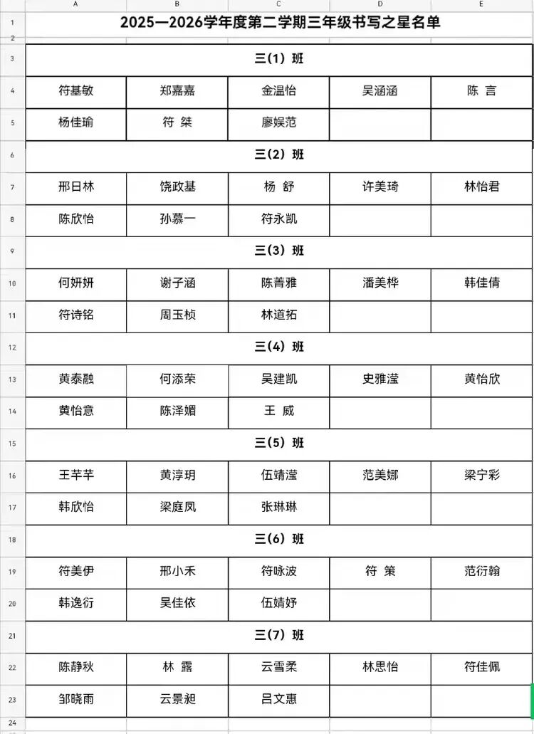 三年级书写之星