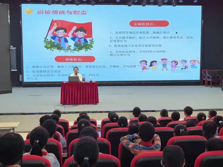 从日常行为监督到文明礼仪引导,再到校园环境维护,潘小丽老师细致讲解岗位核心职责:在教学楼大厅、楼梯通道等区域提醒同学遵守秩序,带头问好、督促规范佩戴红领巾,随手拾捡杂物、爱护公物。字字句句,让每一位监督员牢记“服务者”与“榜样者”的身份定位。