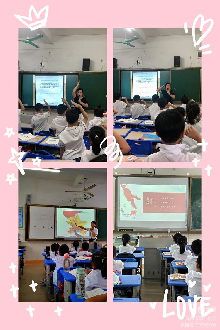 徐敏校长、韩东升副校长、韩武副校长、程婉秋副校长、大队辅导员蔡丽妹、大队副辅导员杜雨雨老师,给一年级的6个中队授予中队旗。