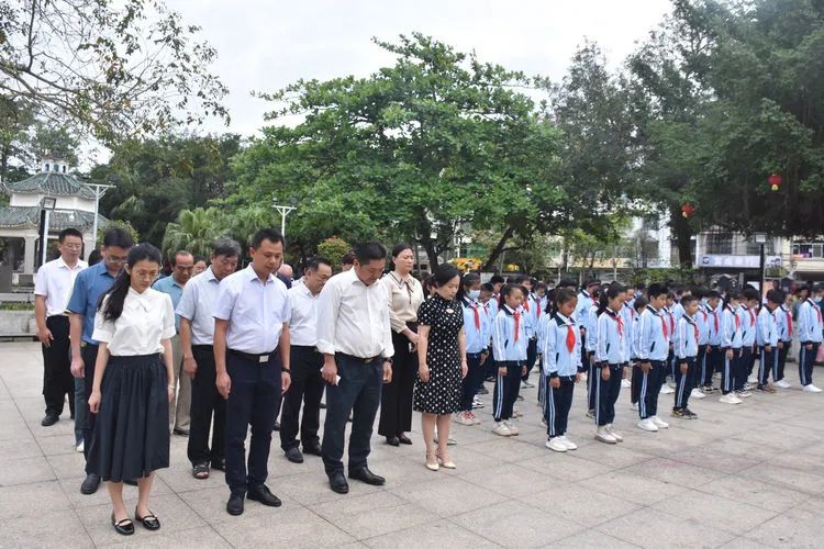 市关工委常务副主任符策万,市教育局关工委常务副主任林明汉,市妇联副主席薛彩云,团市委副书记陈扬凡,文城镇政府副镇长龙伟,文昌市第一小学校长徐敏及文城镇退役军人服务站黄蔚主任等领导向烈士纪念碑敬献花篮并整理挽联。