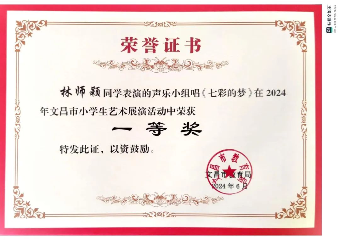 小组唱《七彩的梦》荣获2024年文昌市小学生艺术展演活动(声乐)一等奖!