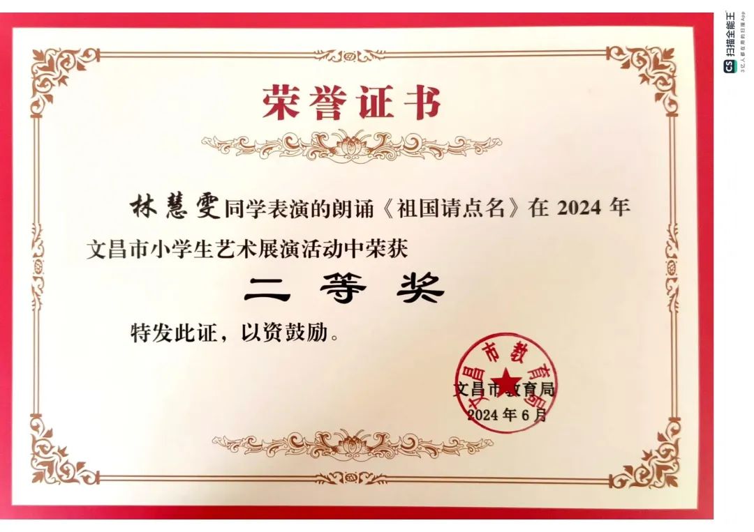 朗诵节目《祖国请点名》荣获2024年文昌市小学生艺术展演活动(朗诵)二等奖!