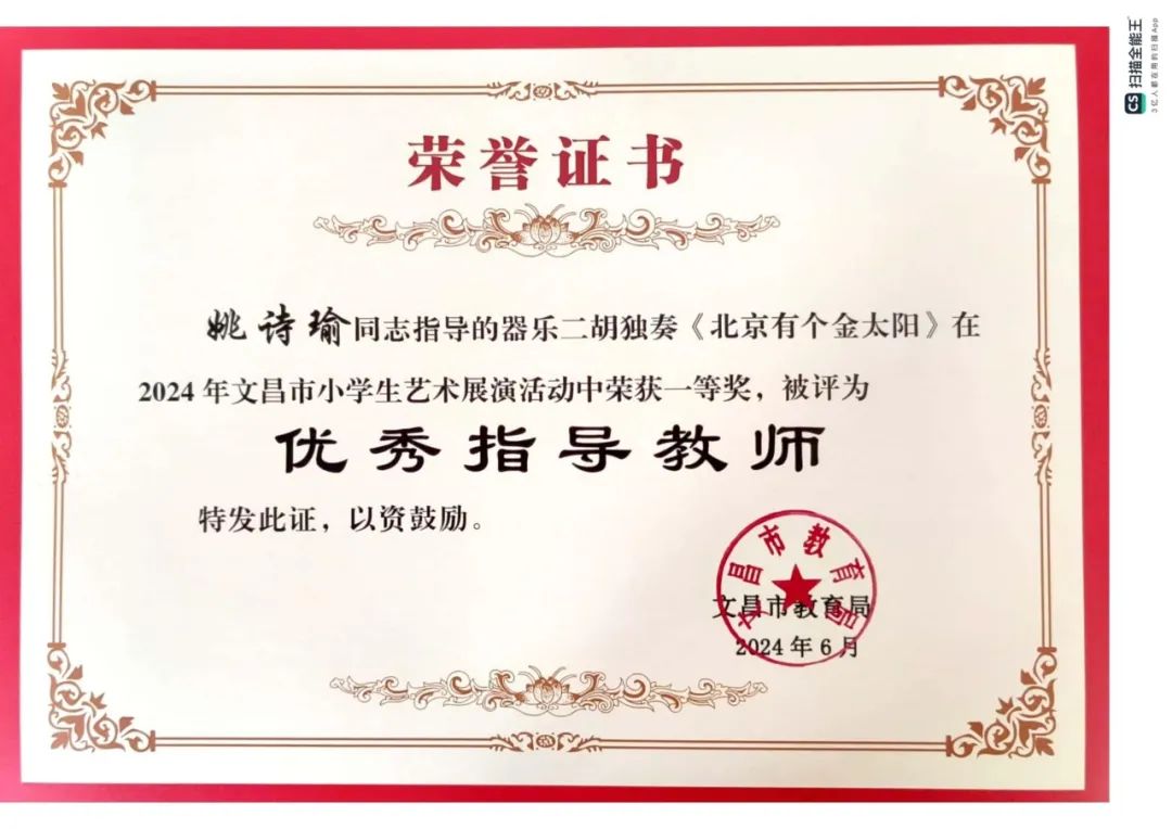 二胡独奏《北京有个金太阳》荣获2024年文昌市小学生艺术展演活动(乐器)一等奖!