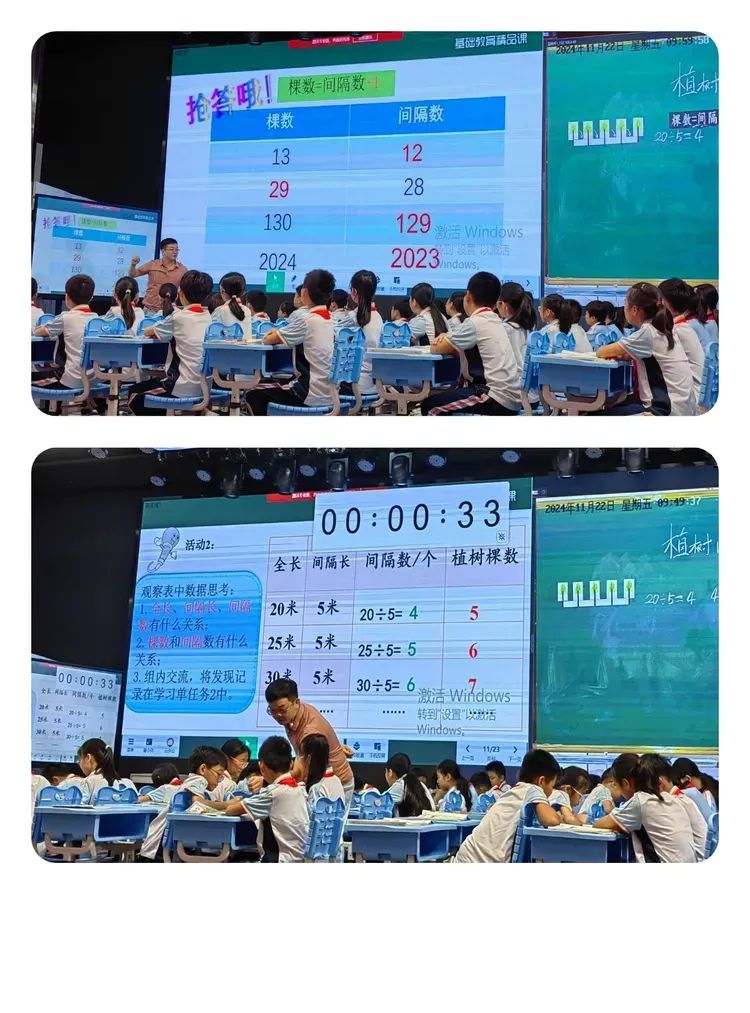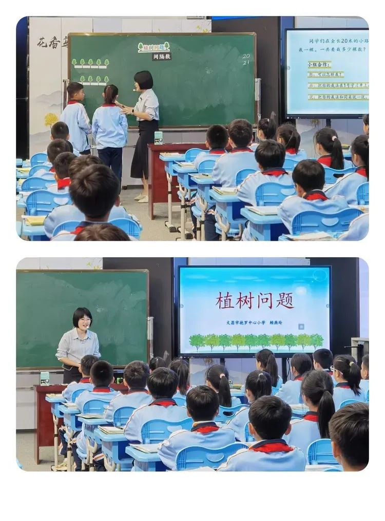 老师通过利用智慧中小学平台上70周年阅兵式的视频,让学生了解士兵之间的间隔和间隔数,再通过寻找生活中的“间隔”引入本节课。课堂中,学生通过观察、猜测、动手验证、推理得出规律,再运用规律解决生活中的问题,并从中体会到植树问题与生活之间的紧密联系。黄老师还注重渗透数形结合、化繁为简、一一对应的数学思想,培养学生抽象和概括的能力。