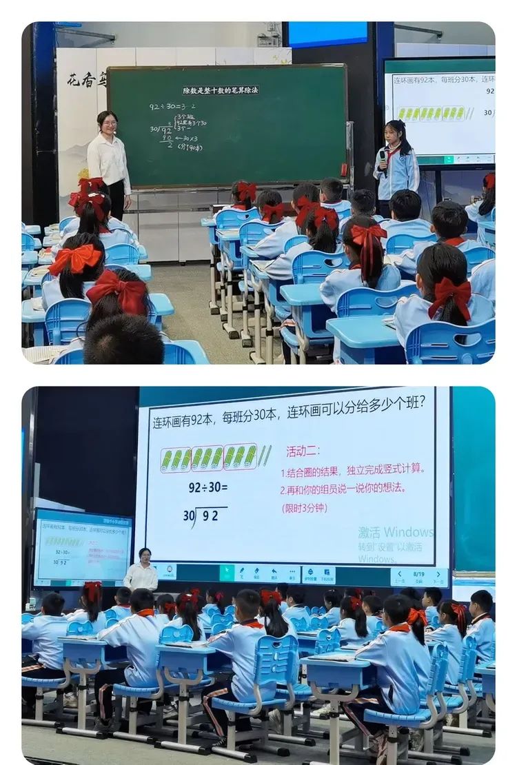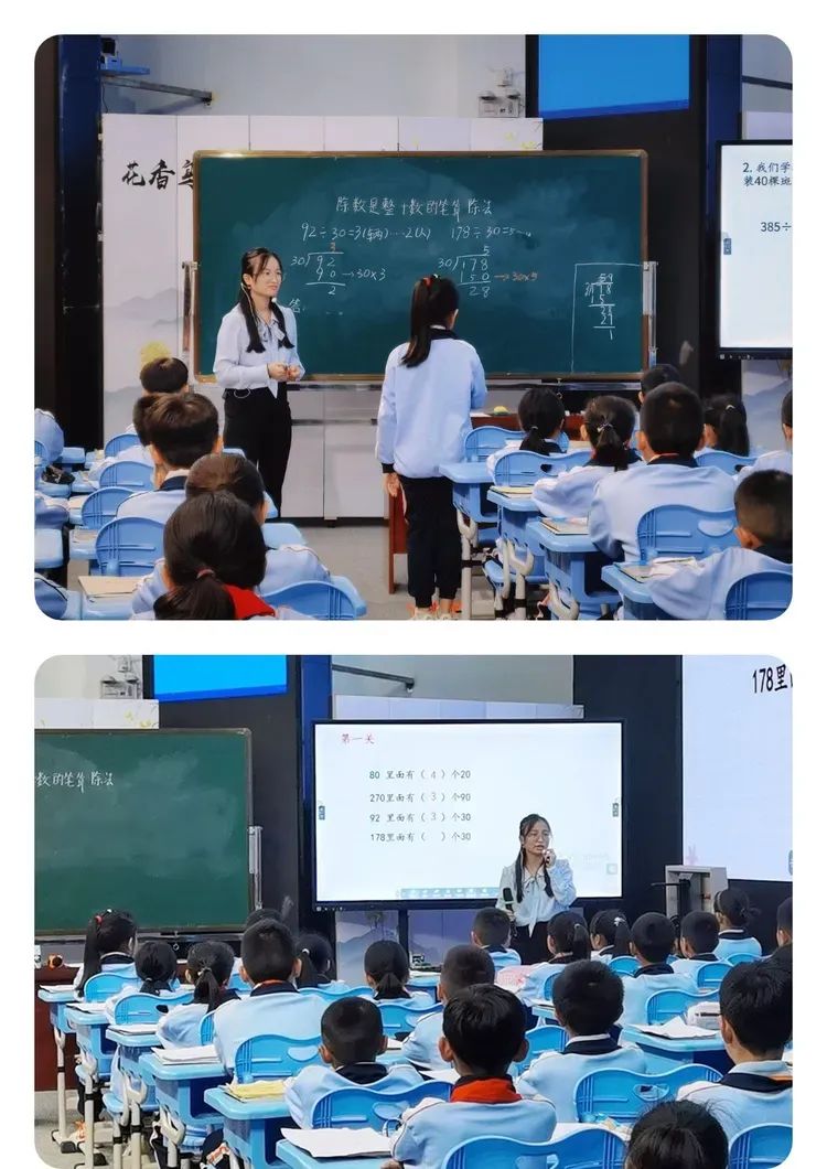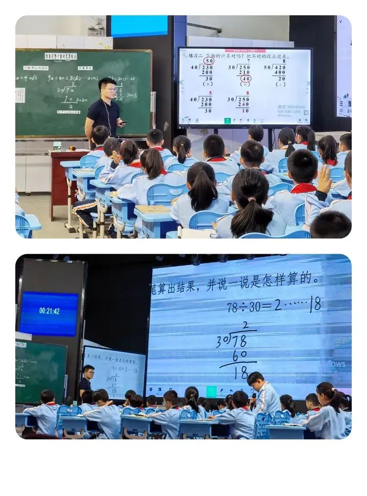 本节课老师以播放重兴的斑兰农庄的相关视频为切入点与学生交流,并创设闯关游戏,既让学生复习除数是一位数的笔算除法的计算方法,又激发了学生学习的兴趣。在探究92÷30的过程中,通过估一估,算一算,说一说等多种学习方式,让学生理解算理和算法,同时借助智慧中小学平台中的视频讲解,进一步帮助学生理解“3为什么写在个位上”。最后在观察和比较中,建构算法。