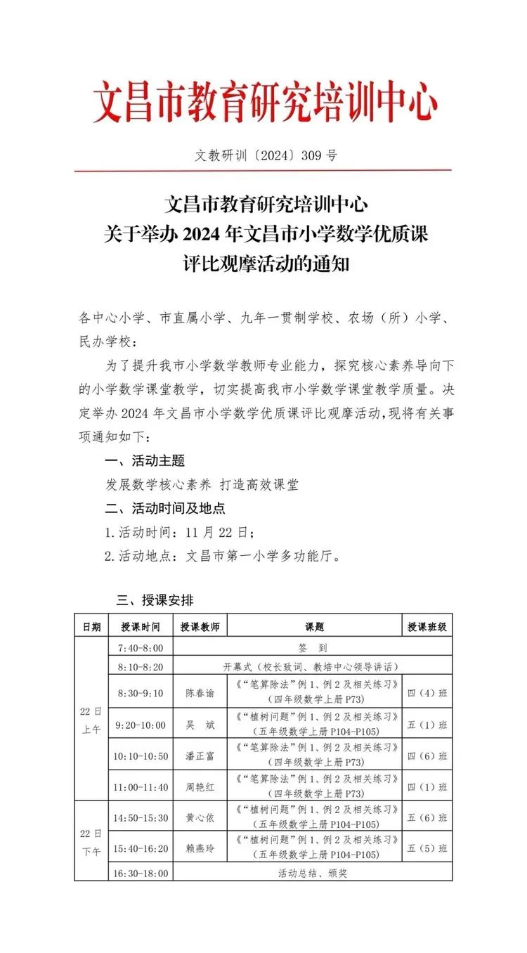 冬意渐浓,携一缕暖阳的芬芳,凝一份教育的热情。为了提升我市小学数学教师专业能力,探究核心素养导向下的小学数学课堂教学,切实提高我市小学数学课堂教学质量。文昌市教育研培训中心于2024年11月22日在市一小举办了文昌市小学数学优质课评比观摩活动。参赛的六位选手都是我市小学数学课堂教学片区评比一等奖获得者,我市各学校数学教师近300人参加本次活动。