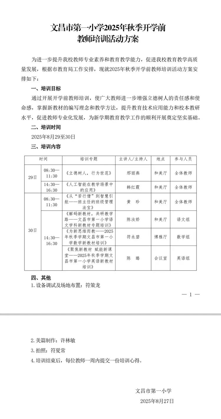 在2025年8月29至30日,文昌市第一小学围绕师德、教学技能、学科教材三大维度设计培训;以“专家引领+学科实操”形式,覆盖全体教师与学科分组,为教师专业成长精准搭台。