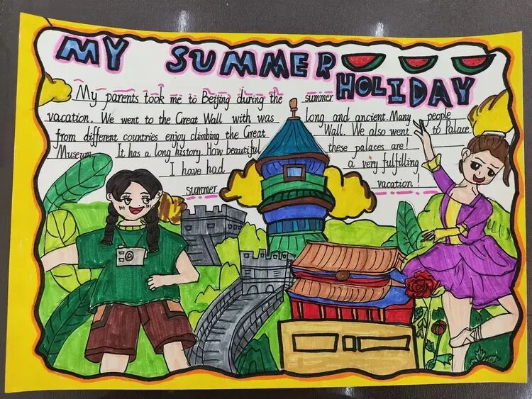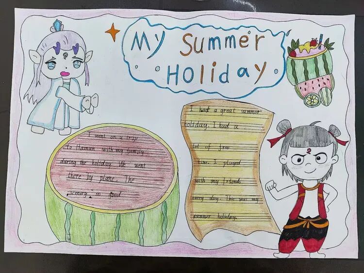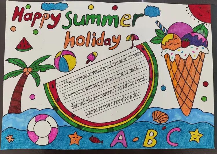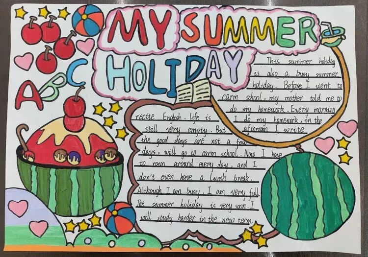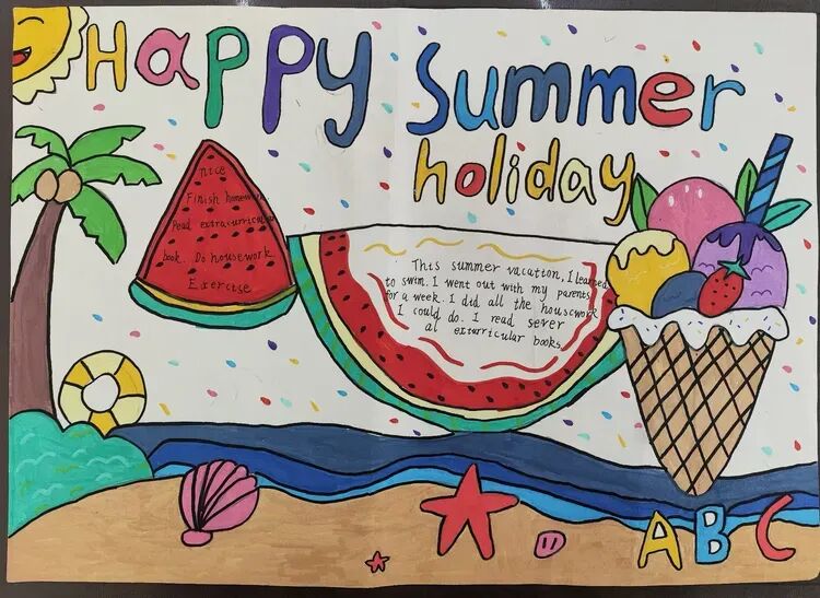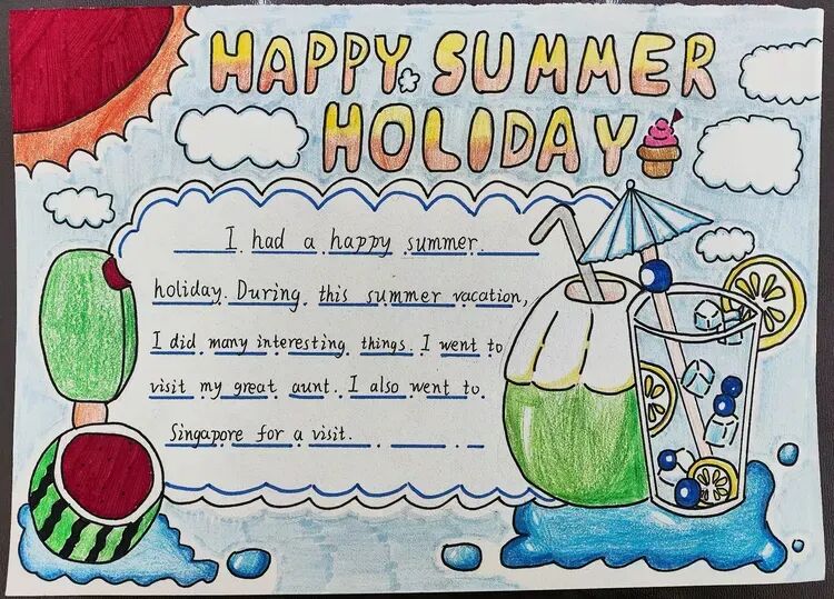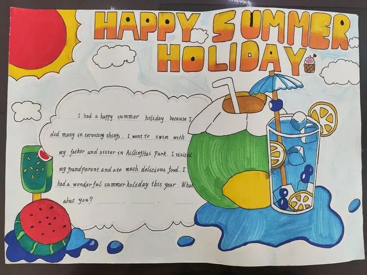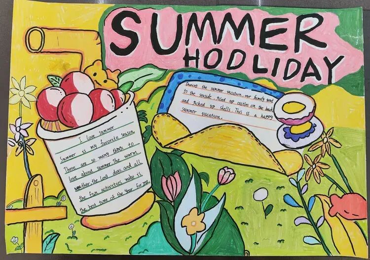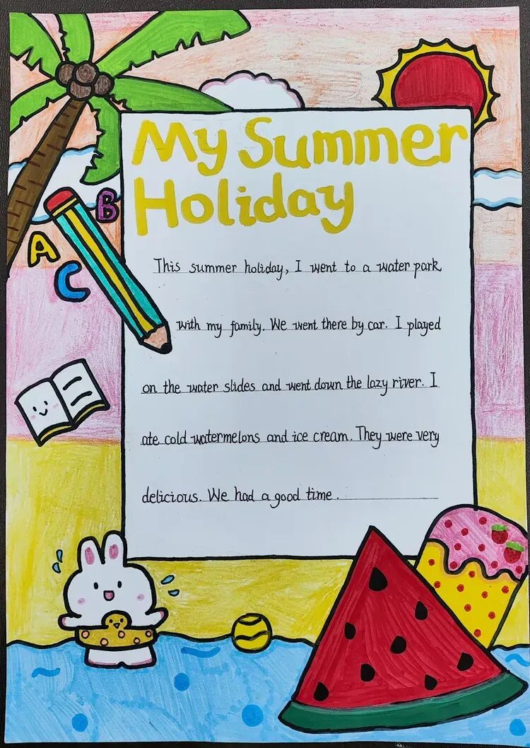当蝉鸣撞碎夏日的阳光,当书包换成泳圈的形状,我们的英语之旅也乘上了彩虹色的热气球!同学们用五彩画笔和灵动文字,把英语课堂搬进了盛夏的画卷中,用英语介绍暑假旅行见闻:这个暑假,我们用英语收藏阳光,把快乐装进行囊!希望这篇充满童趣的文本能激发孩子们的创作灵感,让英语学习和暑假回忆完美融合!