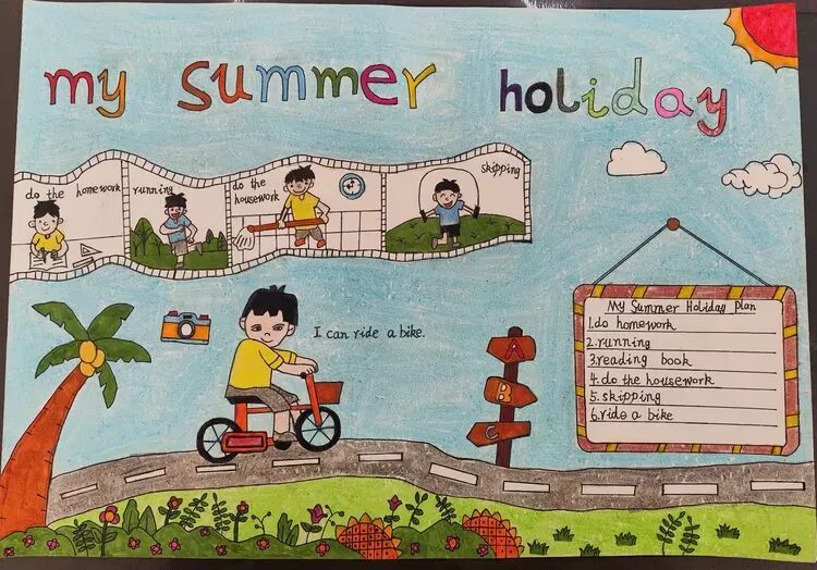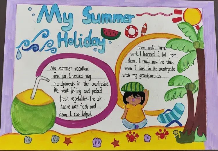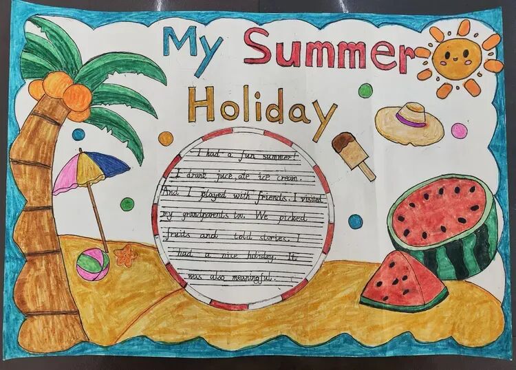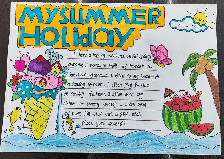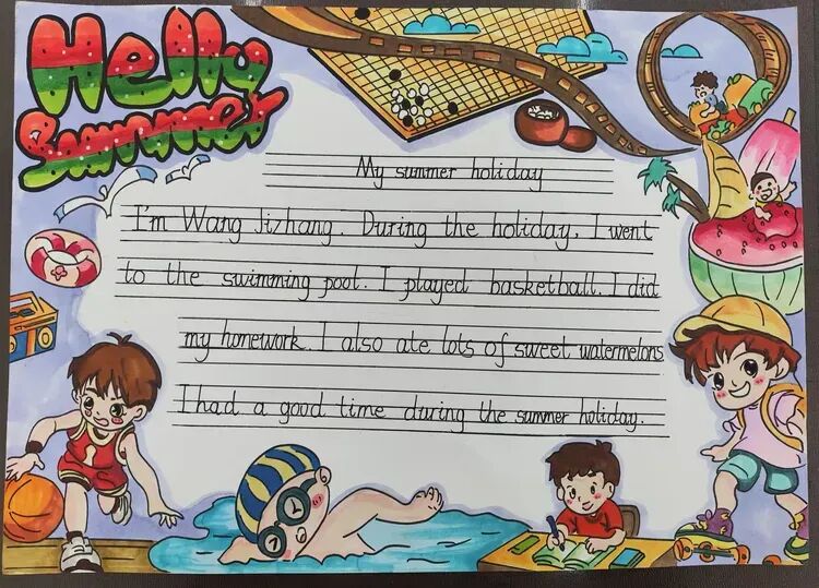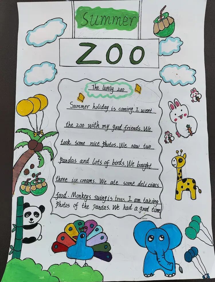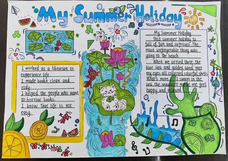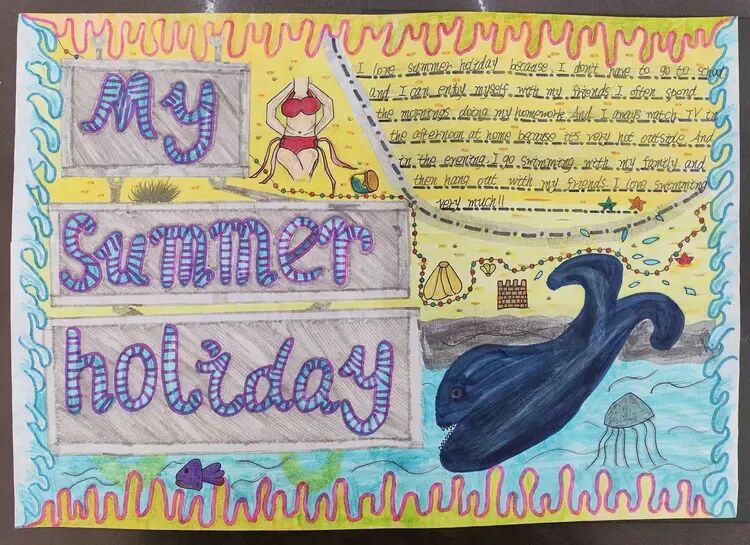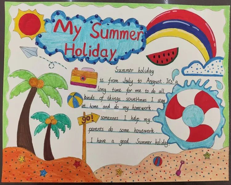 当蝉鸣撞碎夏日的阳光,当书包换成泳圈的形状,我们的英语之旅也乘上了彩虹色的热气球!同学们用五彩画笔和灵动文字,把英语课堂搬进了盛夏的画卷中,用英语介绍暑假旅行见闻:这个暑假,我们用英语收藏阳光,把快乐装进行囊!希望这篇充满童趣的文本能激发孩子们的创作灵感,让英语学习和暑假回忆完美融合!