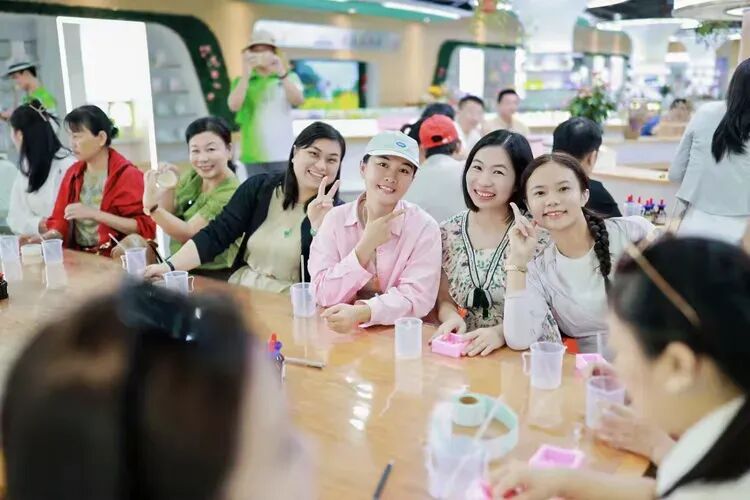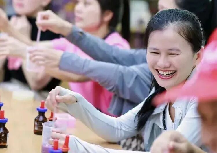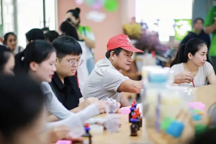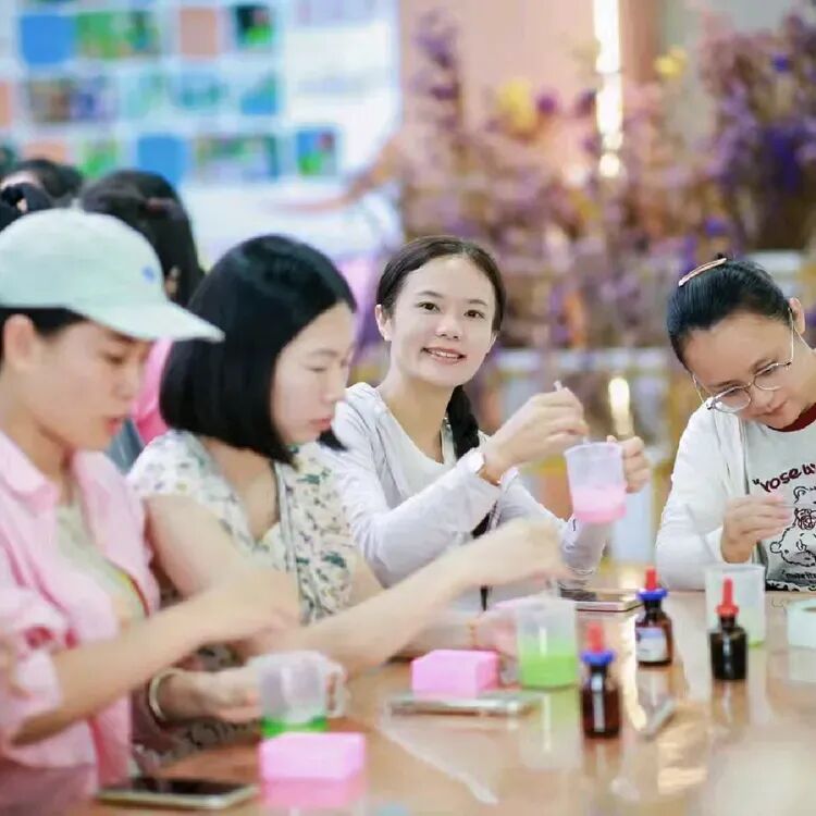 老师们围坐桌前,认真挑选喜爱的精油香型,细致调配原料、精心打磨造型,专注的神情里满是投入,指尖流转间,一块块独一无二的香皂逐渐成型,脸上的笑容也随着成品的诞生愈发灿烂,满是成就感与欢喜。