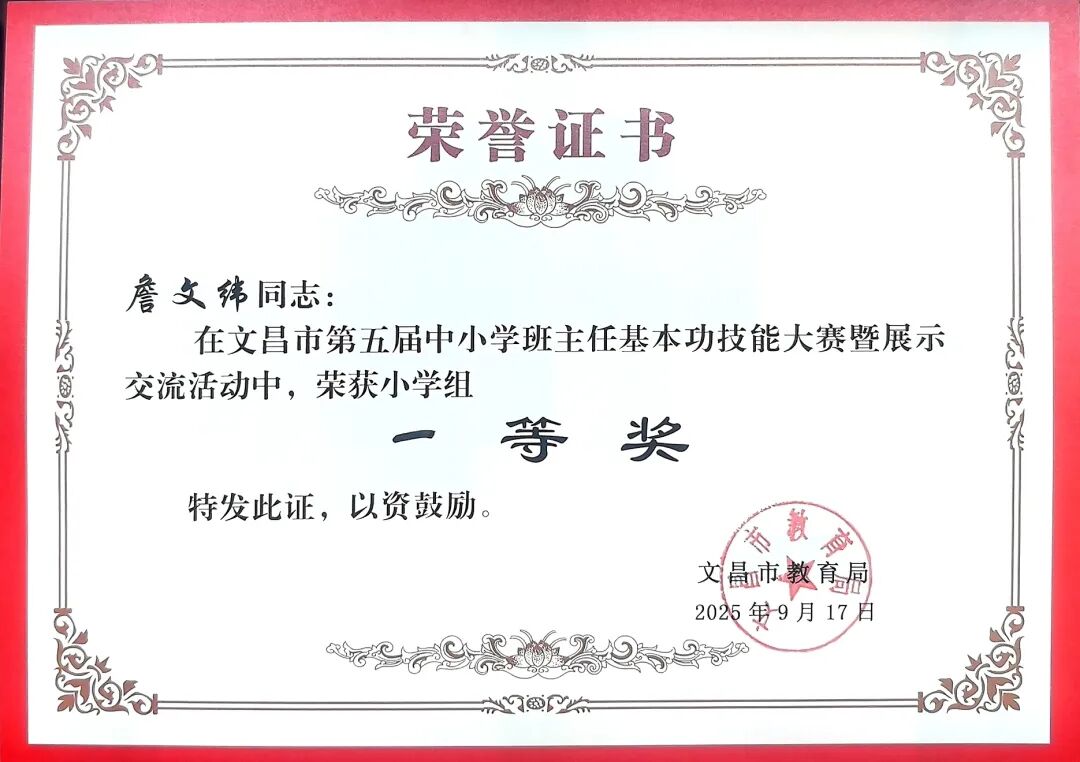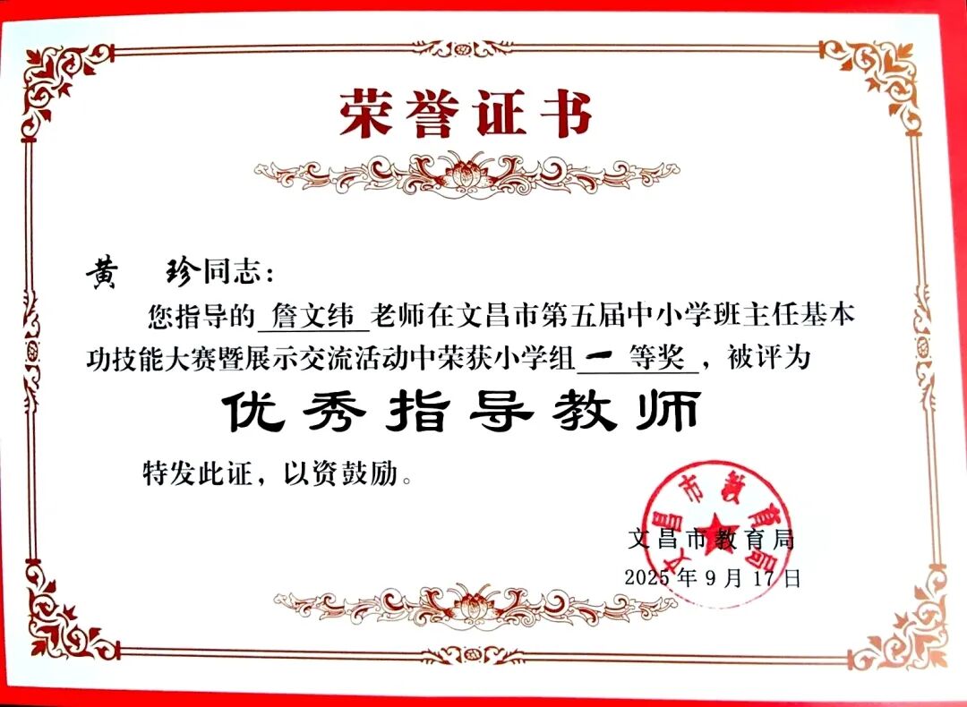 热烈祝贺我校教师詹文纬在文昌市第五届中小学班主任基本功技能大赛暨展示交流活动中,凭借扎实的专业素养、出色的教育智慧和卓越的现场表现,在众多参赛者中脱颖而出,荣获小学组一等奖的优异成绩!同时,我校黄珍老师作为指导教师,在此次活动中给予了精心指导和有力支持,被评选为“优秀指导教师”。