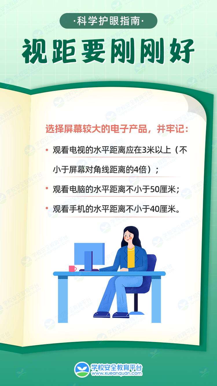 (2)观看距离:电视的观看距离不小于屏幕对角线距离的4倍,电脑的水平观看距离不小于50厘米,手机的观看距离不小于40厘米。