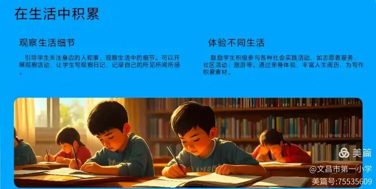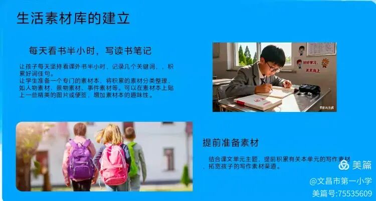 写作,素材的积累特别重要,云老师建议双管齐下:鼓励孩子阅读时积累好词好句,组织学生读书分享会交流积累;引导学生观察身边细节,鼓励参与校园运动会、社区志愿服务等活动,用“观察日记”记录所见所感,并准备专属素材本分类整理,确保写作时有“活内容”可写。