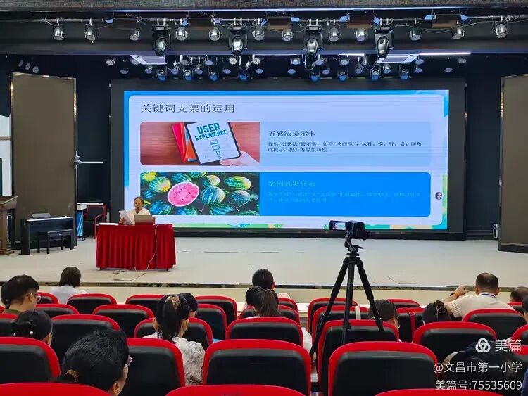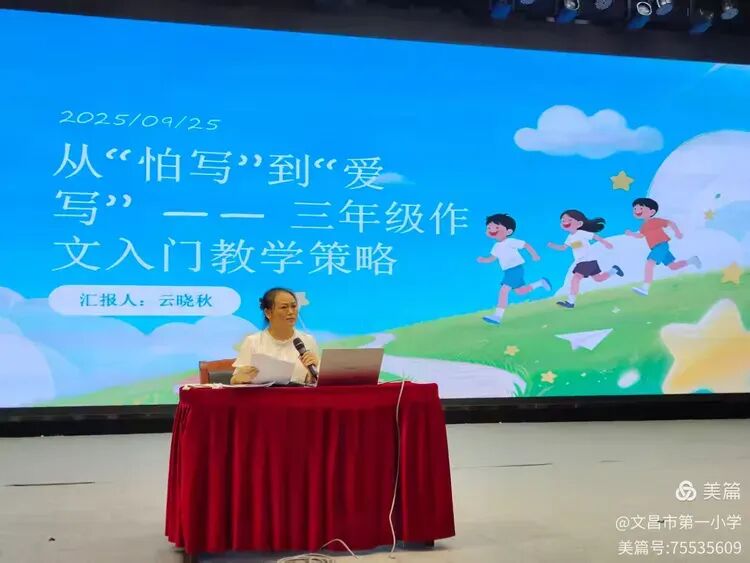 2025年9月30日,文昌市第一小学语文组开展了作文教学专题微讲座活动。本次讲座由云晓秋老师主讲,主题为《从“怕写”到“爱写”—三年级作文入门教学策略》。文昌市第一小学徐敏校长、韩东升副校长及全体语文老师参加活动。