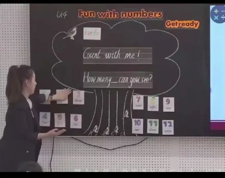 李老师的课堂以“数字”为主线,巧妙运用“-How many...?-One/Two...Twelve.”等句型,结合多样情境与任务型活动,将语言学习自然融入任务完成过程中。课程伊始,通过热身活动迅速调动课堂氛围,再以谜语引出“神笔马良”的故事,借马良所画鸟的数量,逐步呈现并操练英文数字1到12,环节设计富有趣味,衔接流畅。学生在层层推进的课堂结构中,顺利实现从接触、理解到运用的过渡,思维连贯,参与积极。