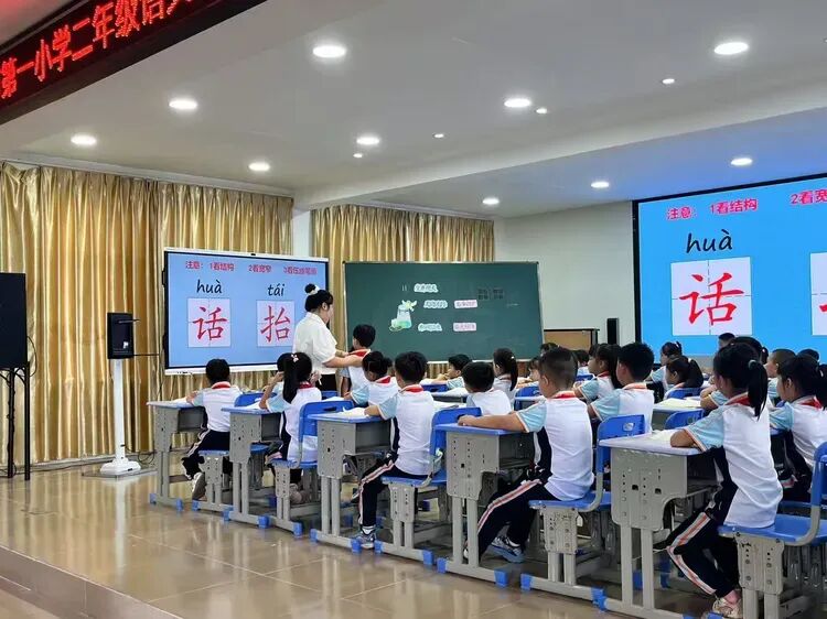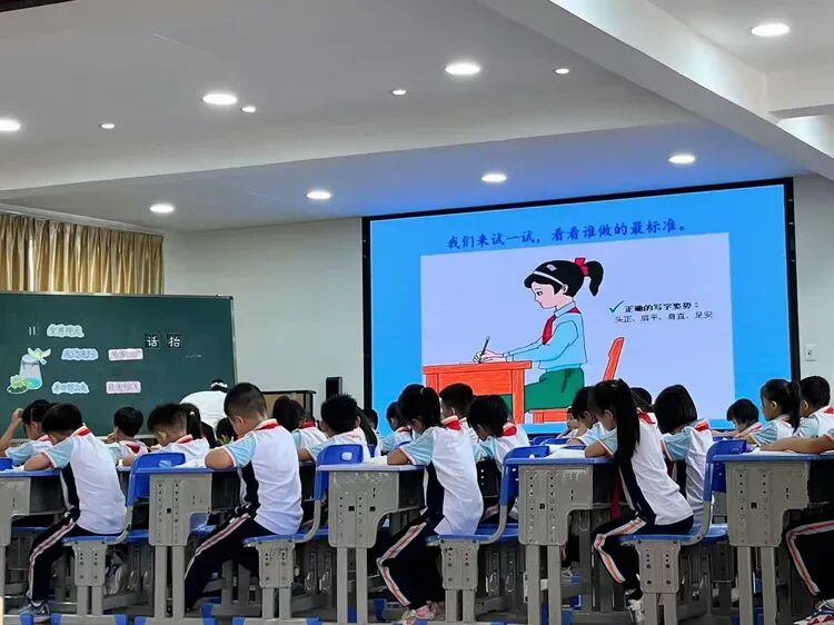 课堂转入写字环节,符惠老师重点指导“话”、“抬”二字:先板书示范,强调结构和书写要点;同时投影正确写字姿势示意图,提醒孩子调整坐姿。