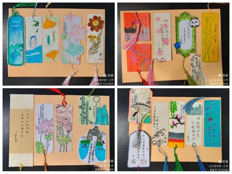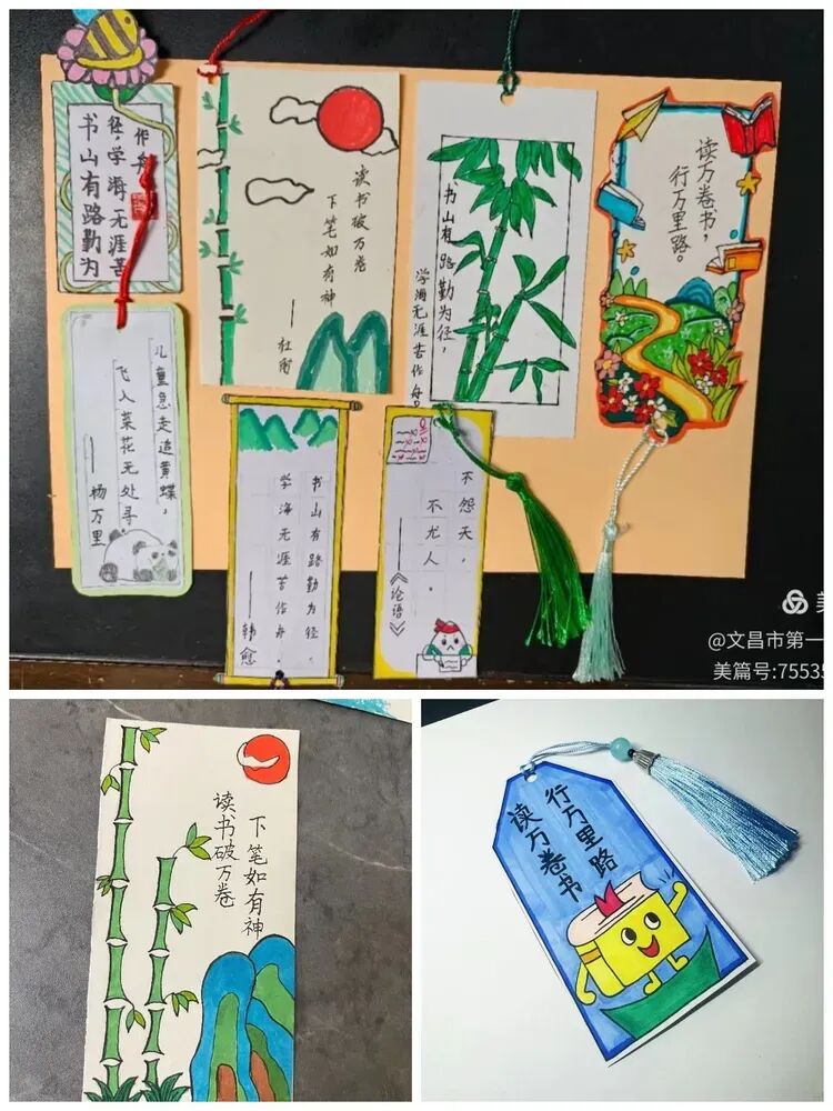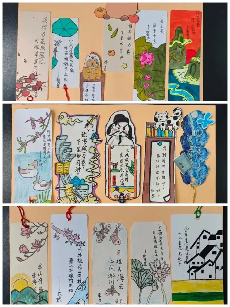 三四年级的同学用彩笔在卡纸上把喜欢的读书格言,和脑海里的阅读画面融在一起,有的画得灵动可爱,有的做成立体小卡,还有的用彩绳系出精巧的挂饰。那些小小的书签,裹着墨香与创意,被小心放进书本里,成了阅读时最贴心的“小陪伴”。每一张作品,更是把“方寸之间藏书香”的巧思,展得淋漓尽致。