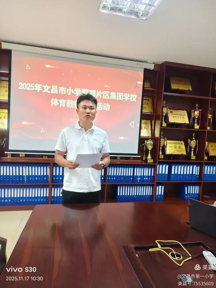 文昌市第一小学校长徐敏致辞并做方案解读,他结合体育的核心价值,作出深刻阐述:“体育课堂不只是传授运动技能、帮助学生强身健体的阵地,更是渗透德育、以体育育人,用体育帮助每个孩子成长的重要载体。而安全是体育课堂不可逾越的底线,是保障教学活动顺利开展的生命线。我们要始终将安全理念贯穿课堂全程,让‘安全’成为守护孩子们健康成长、快乐运动的最坚实‘奖杯’。”