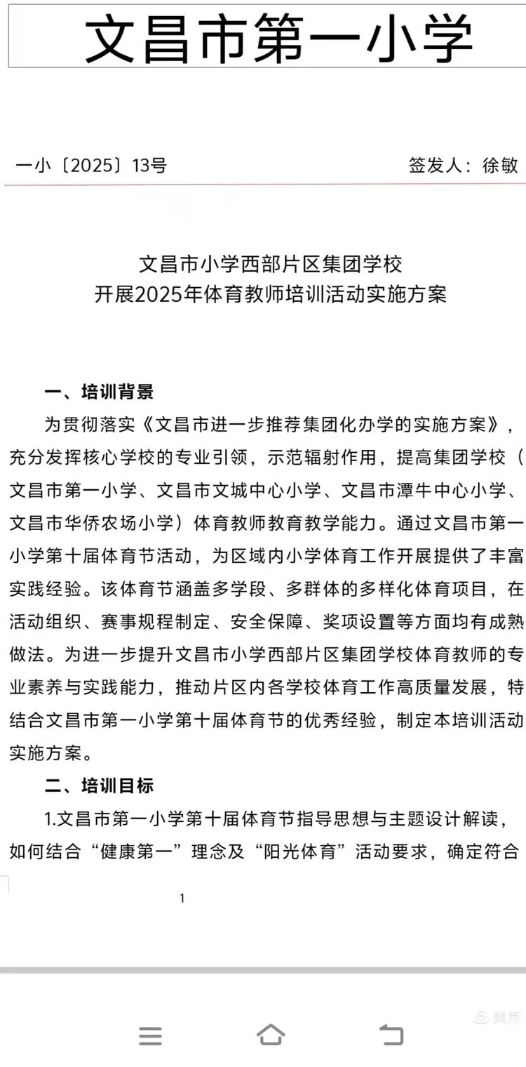 为贯彻落实《文昌市进一步推荐集团化办学的实施方案》,充分发挥核心学校的专业引领,示范辐射作用,提高集团学校(文昌市第一小学、文昌市文城中心小学、文昌市潭牛中心小学、文昌市华侨农场小学)体育教师教育教学能力。更为了进一步提升文昌市小学西部片区集团学校体育教师的专业素养与实践能力,推动片区内各学校体育工作高质量发展,文昌市第一小学结合第十届体育节的优秀经验,在11月17日开展片区体育教师培训活动。