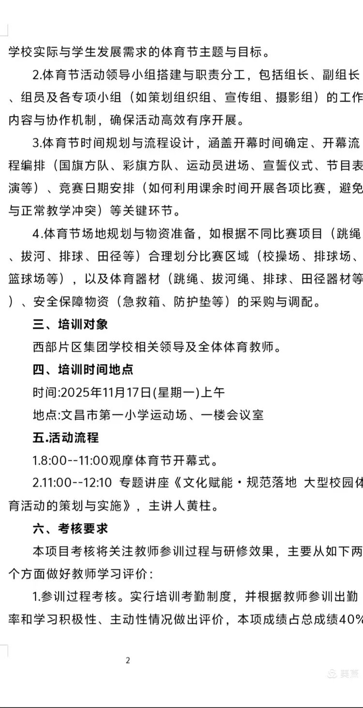 此次体育教师培训活动,通过领导的方案解读、高级教师的引领示范、参训教师的互动研讨,实现了理论与实践的深度融合。它不仅是一次技能的淬炼,更是一次教育初心的重温。参训人员纷纷表示,将把培训中所学的先进理念、科学方法与澎湃激情带回各自校园,转化为扎实的课堂教学实践,努力当好学生健康成长的引路人,为我市小学体育教育的高质量发展注入新的活力。